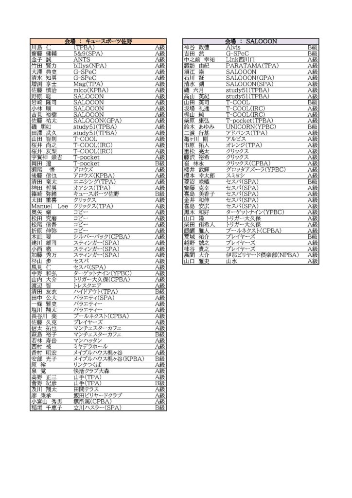 試合方法:ナインボール (A級5rack、B級4rack、C級3rack)