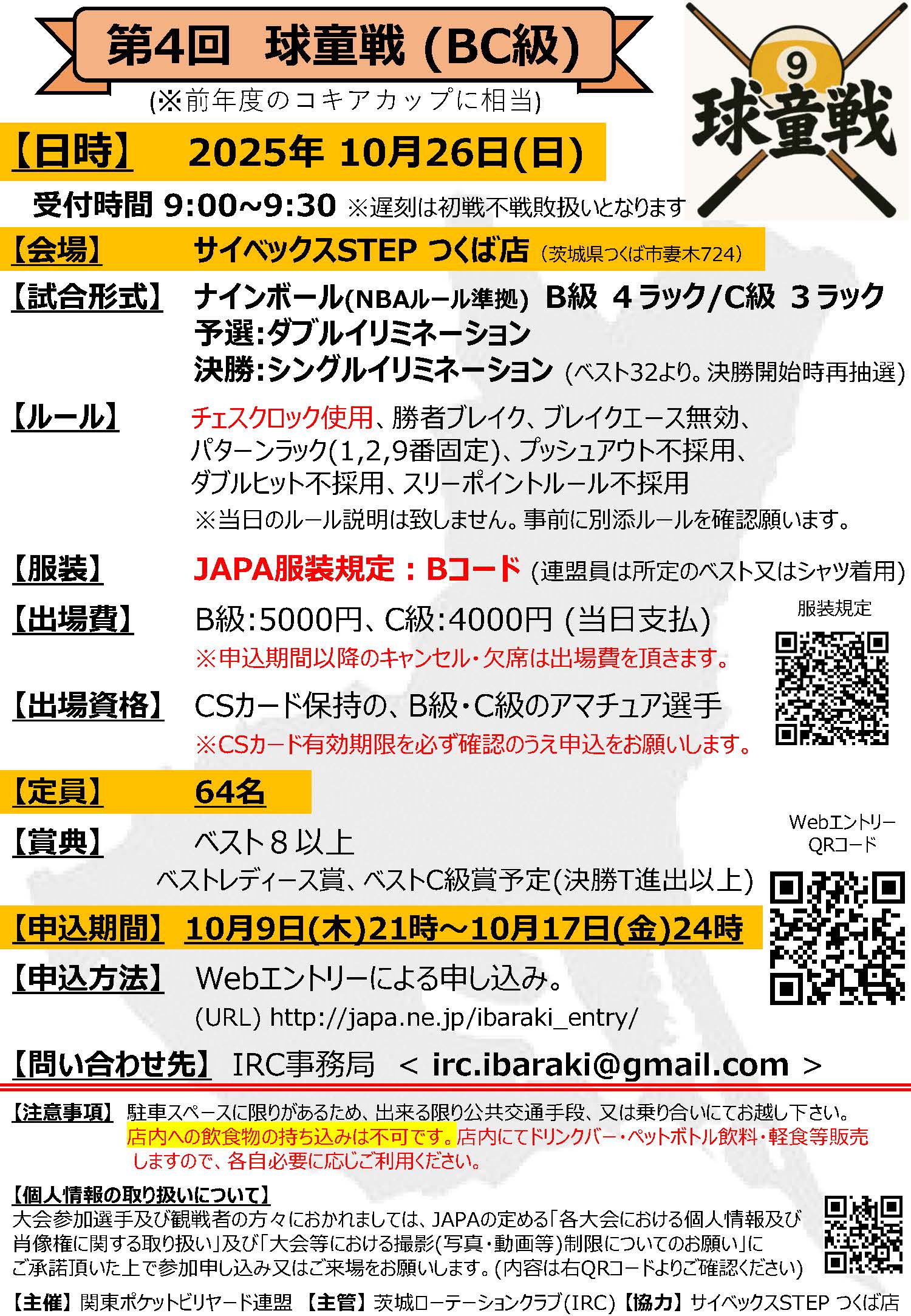 競技:9ボール(B級4ラック、C級3ラック)