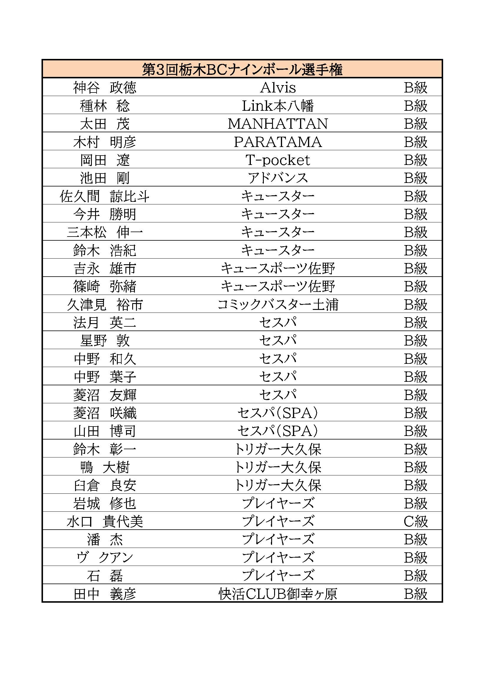 第3回 栃木BCナインボール選手権 、出場選手一覧と組合せ