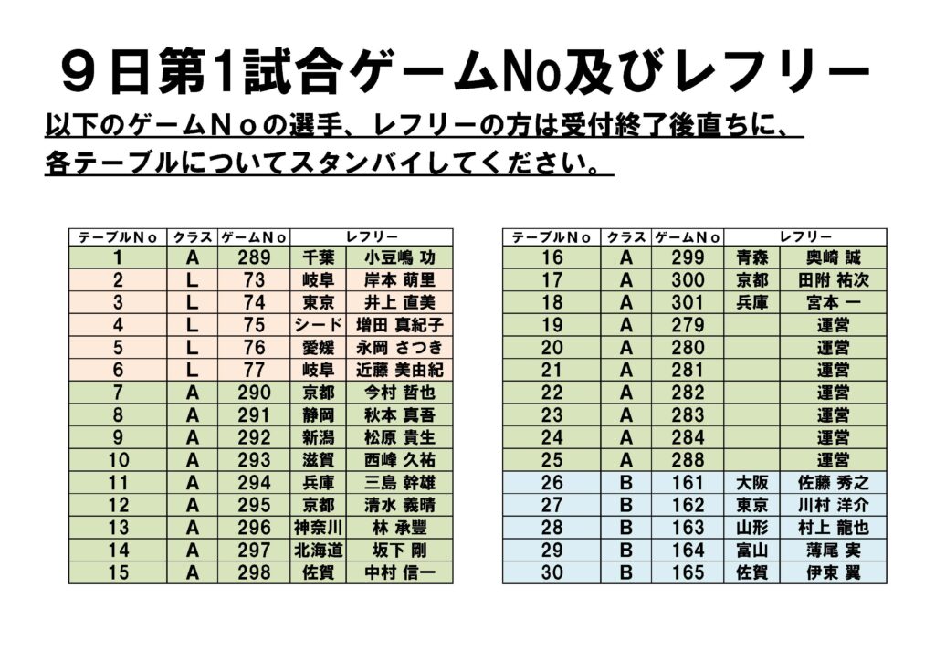 本大会両日とも、最初に開始する1回転目のゲームのテーブル番号、選手及び審判を当ホームページでの告知ならびに会場入口に掲示しておきますので、対象の選手及び審判の方は受付後、準備をお願いします。