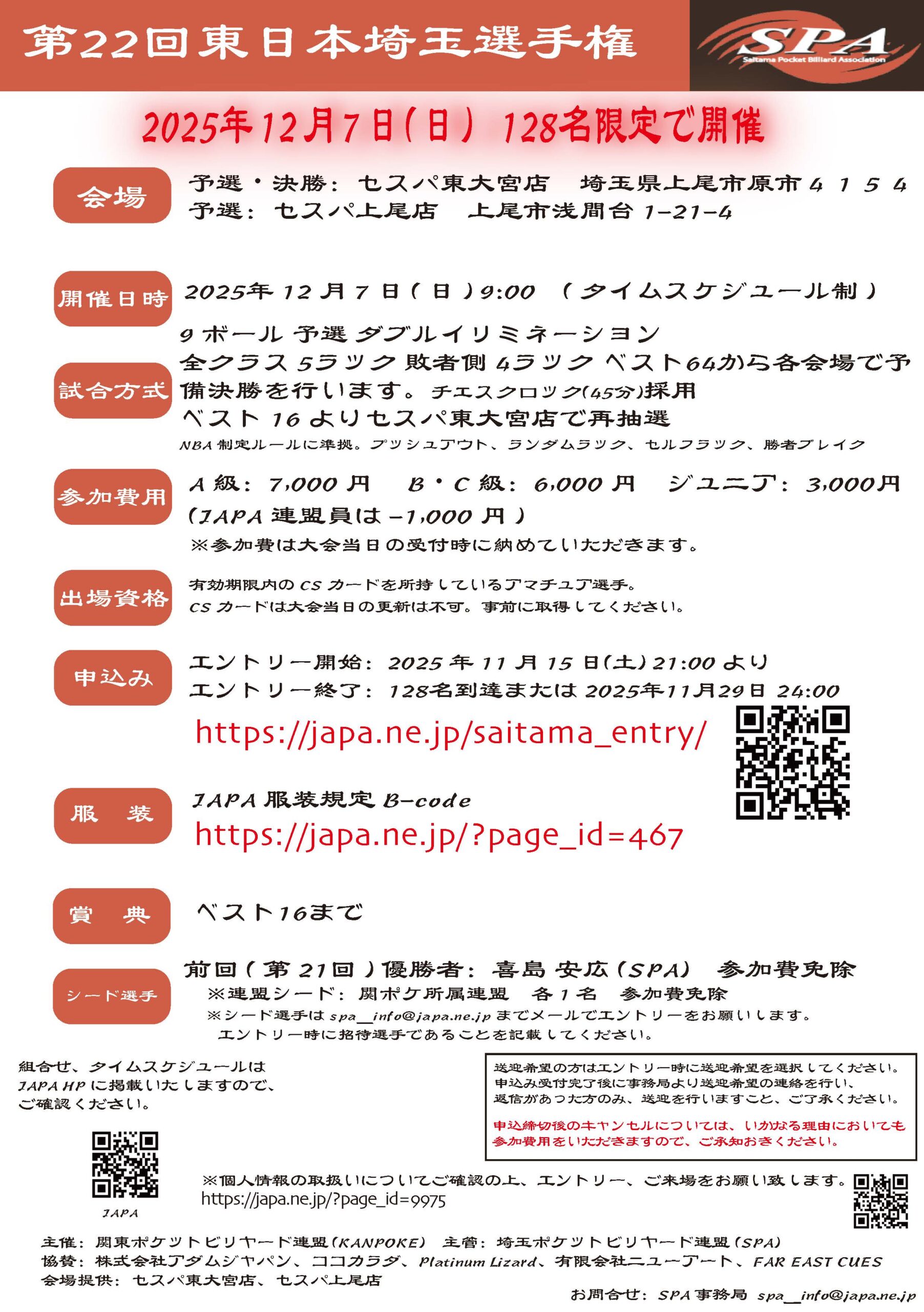 大会主管:埼玉ポケットビリヤード連盟(SPA)