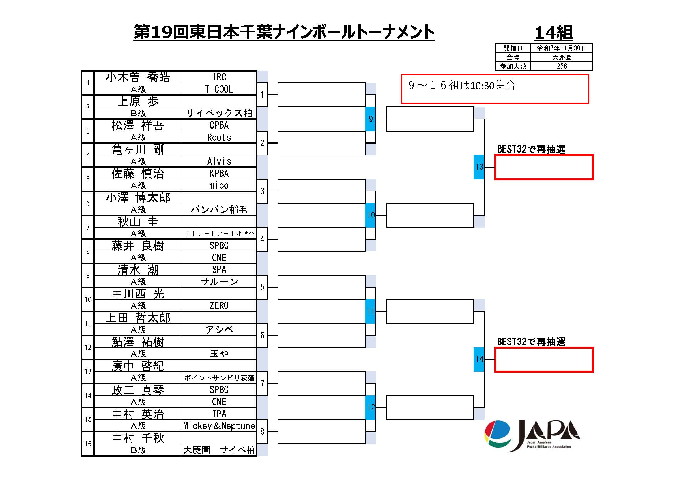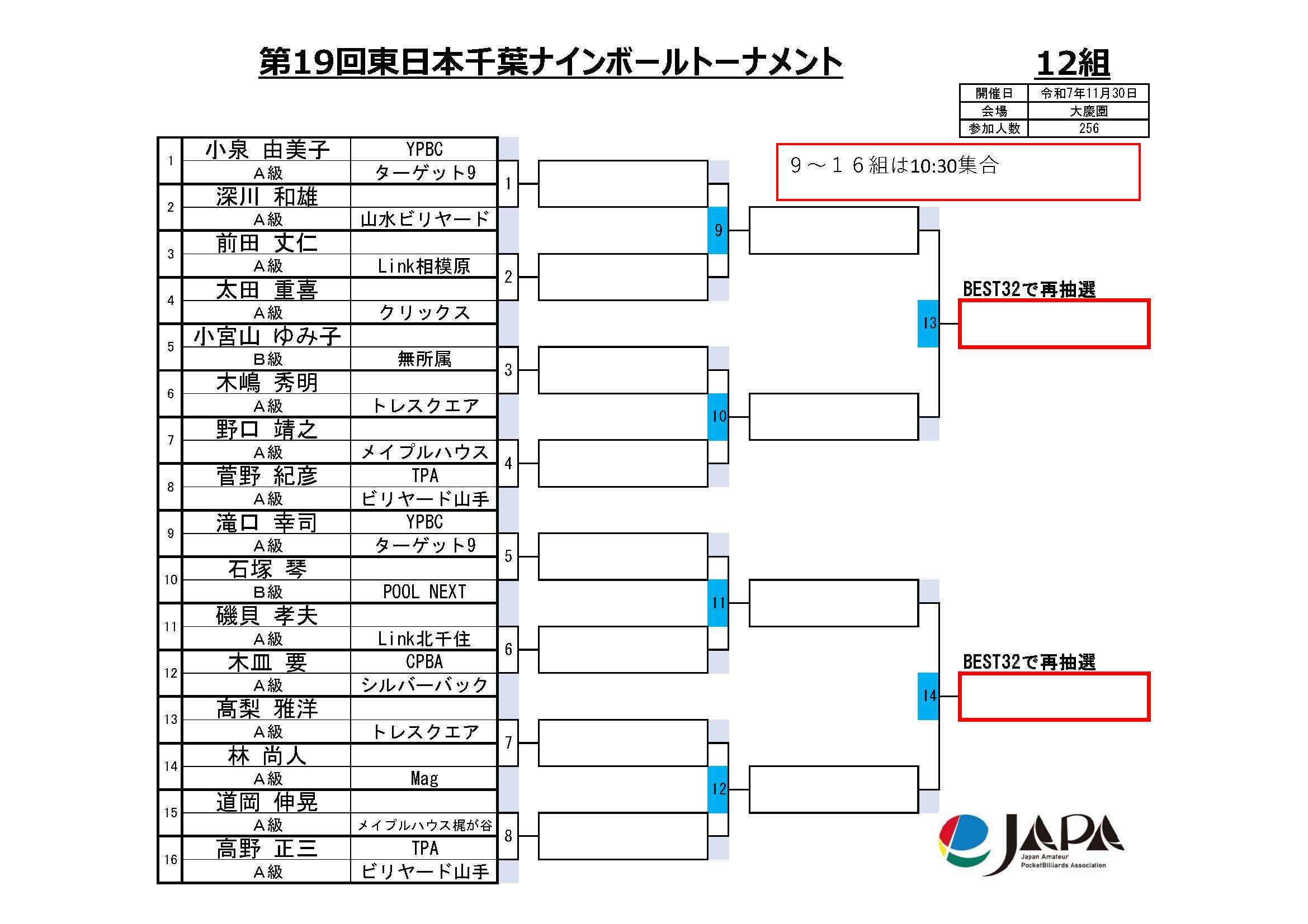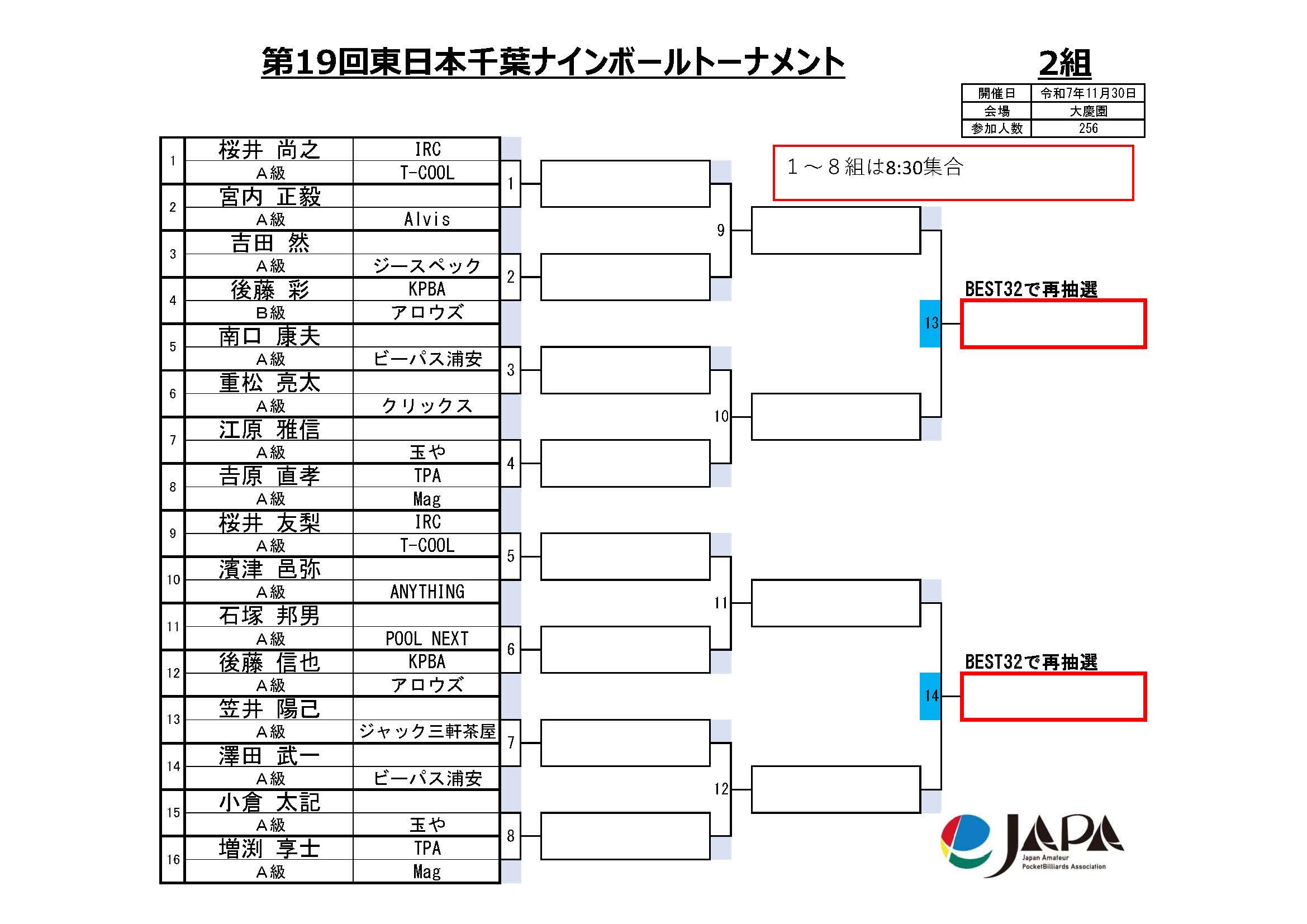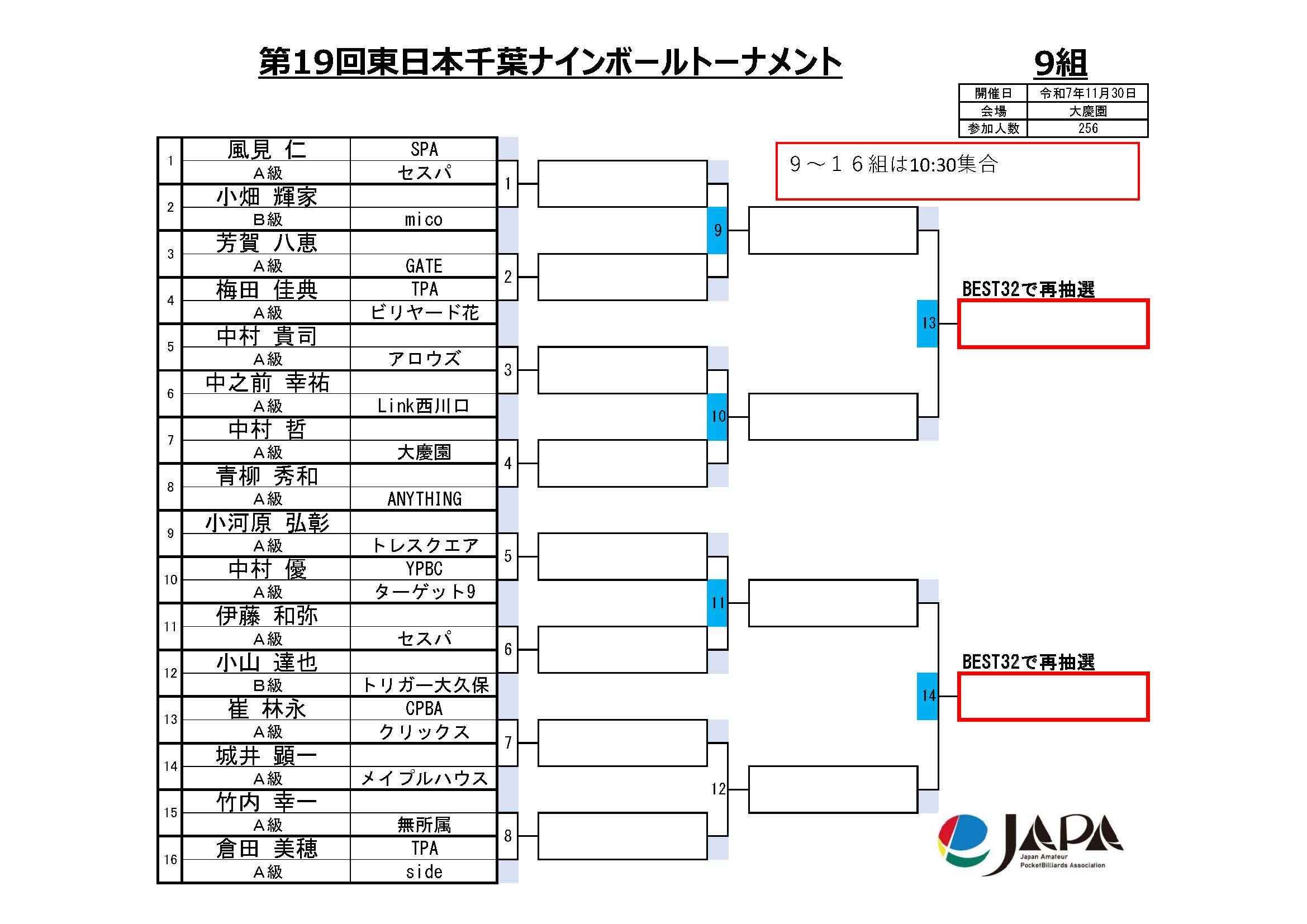 第19回 東日本千葉ナインボールトーナメント、組合せと集合時間