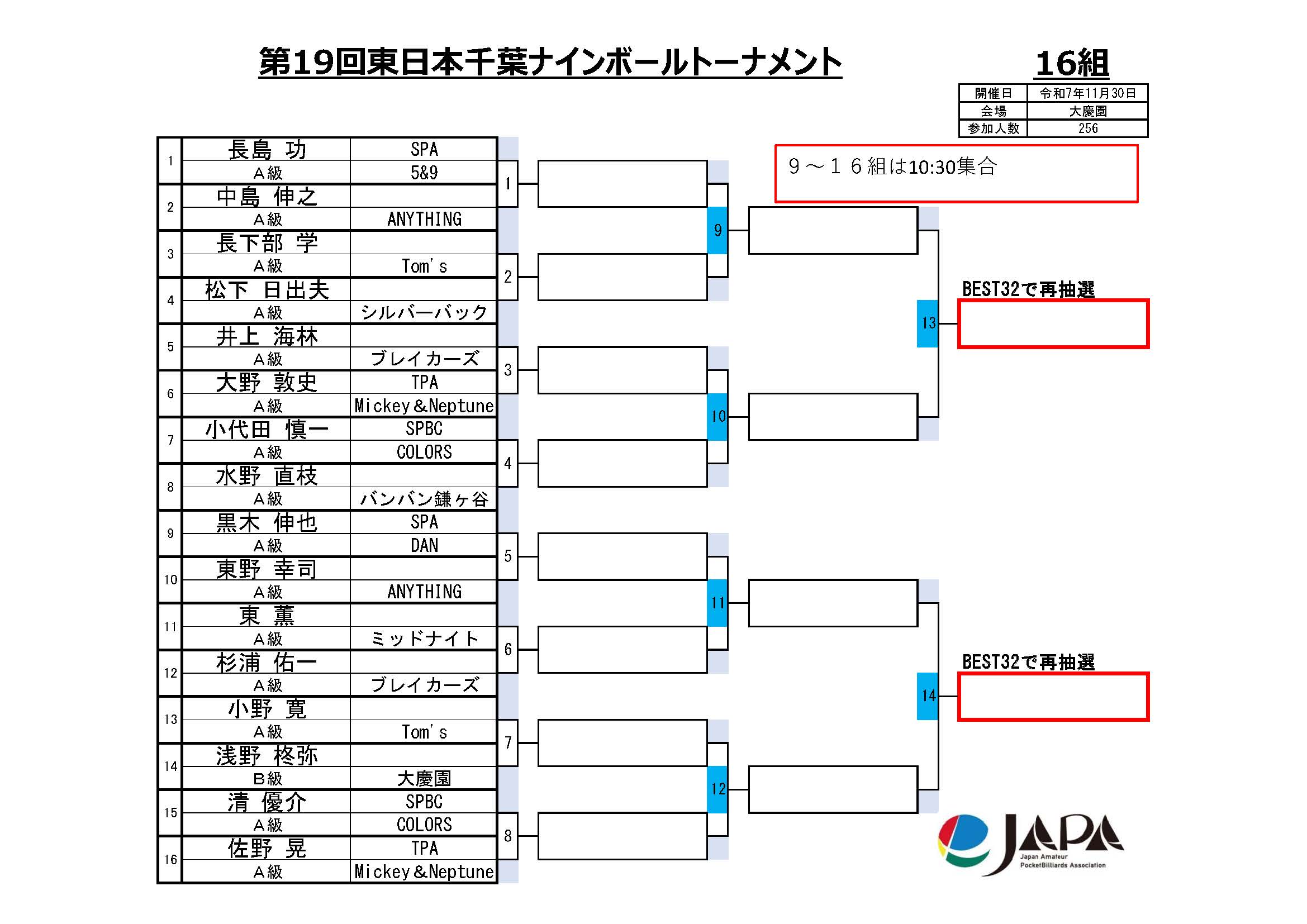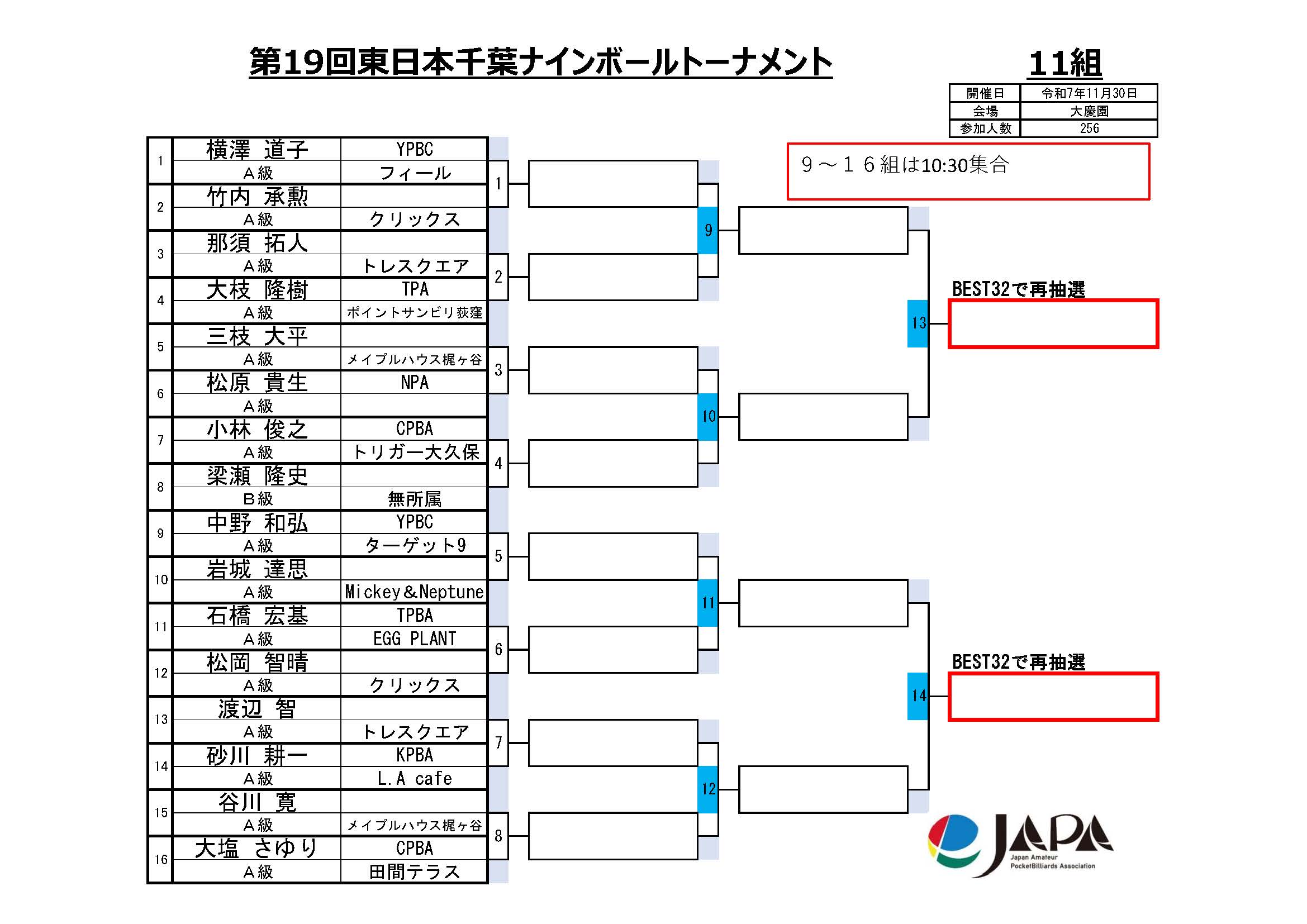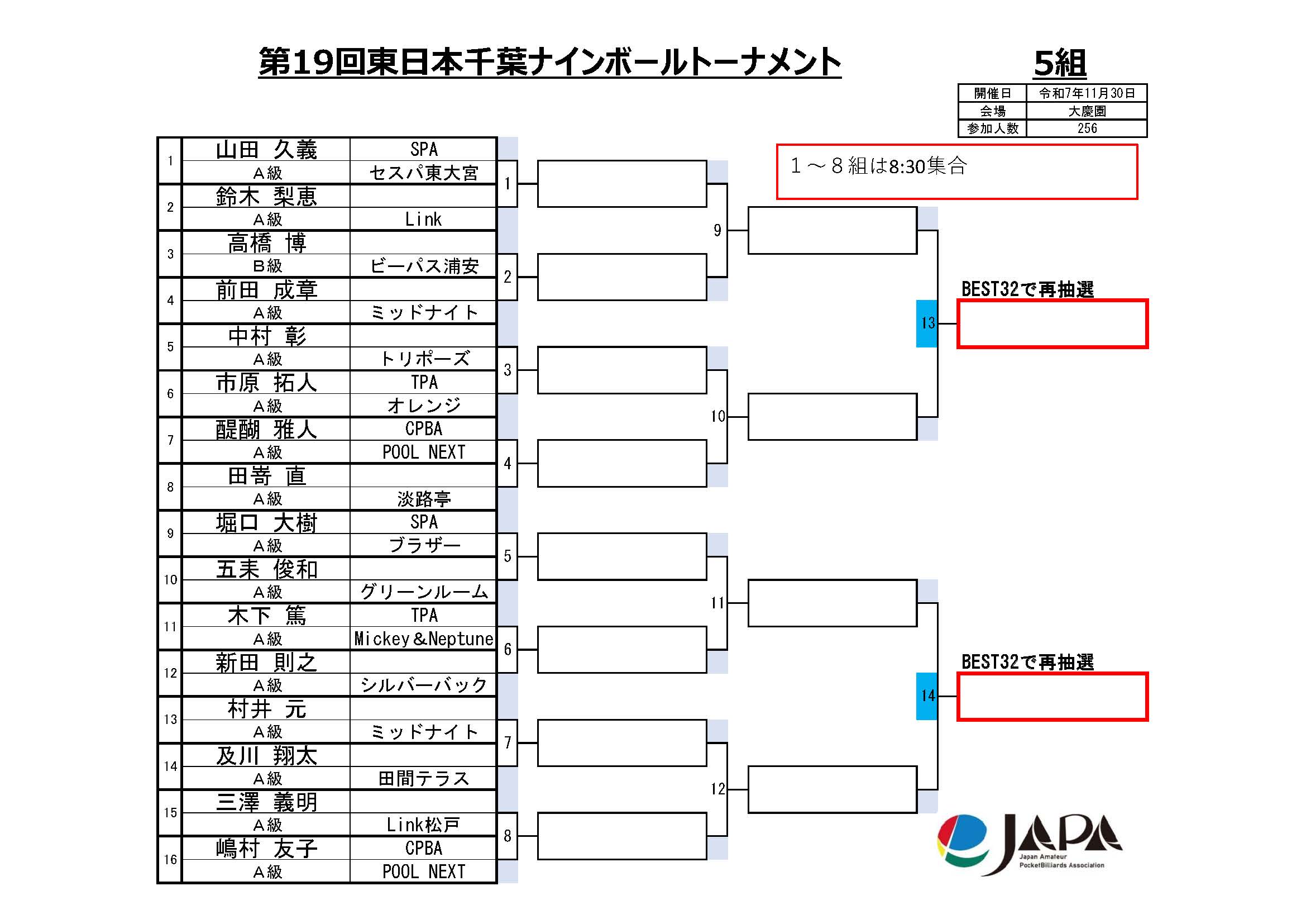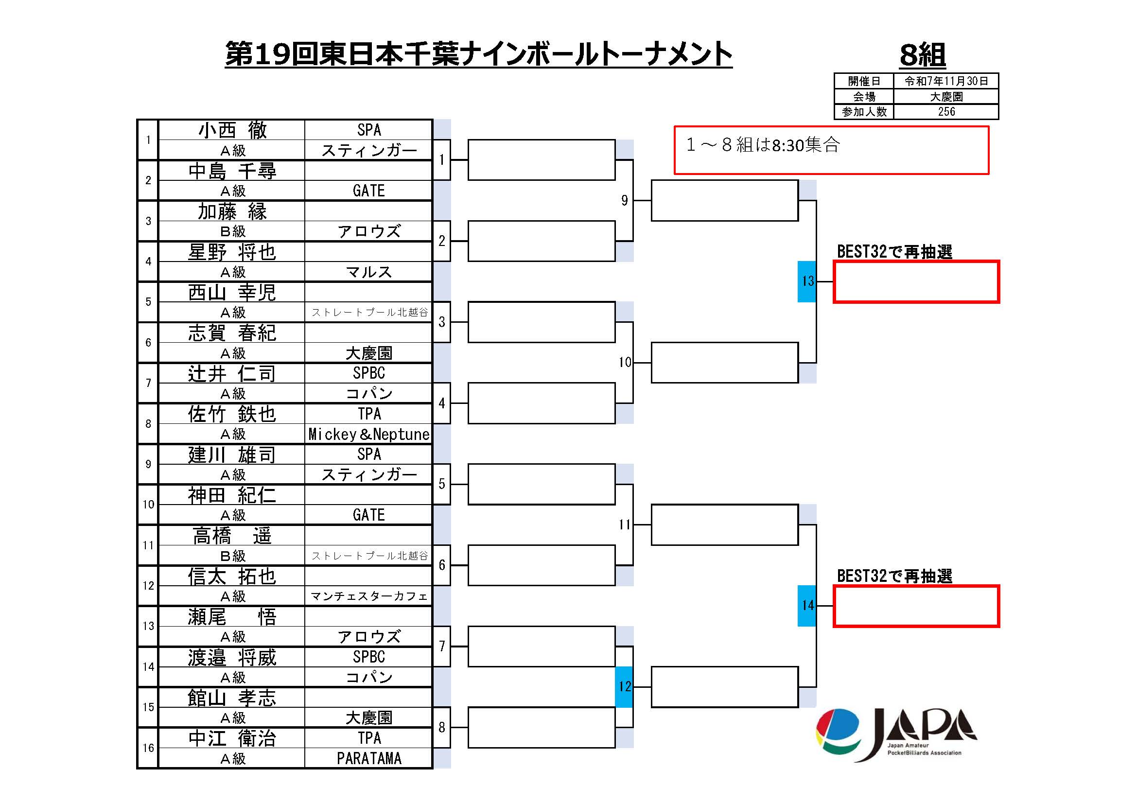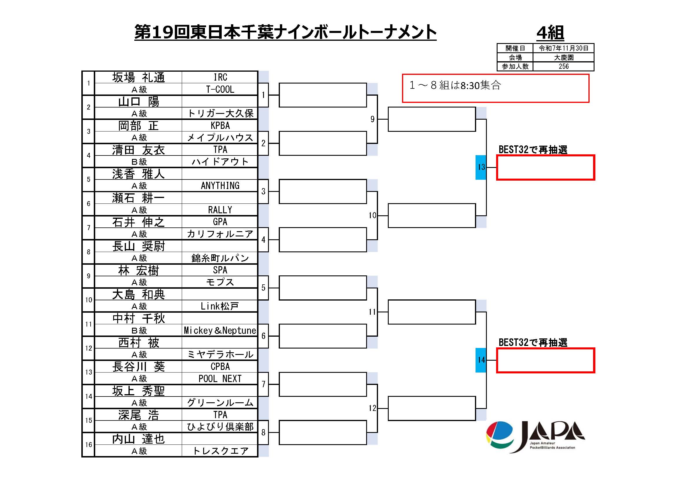 第19回 東日本千葉ナインボールトーナメント、組合せと集合時間
