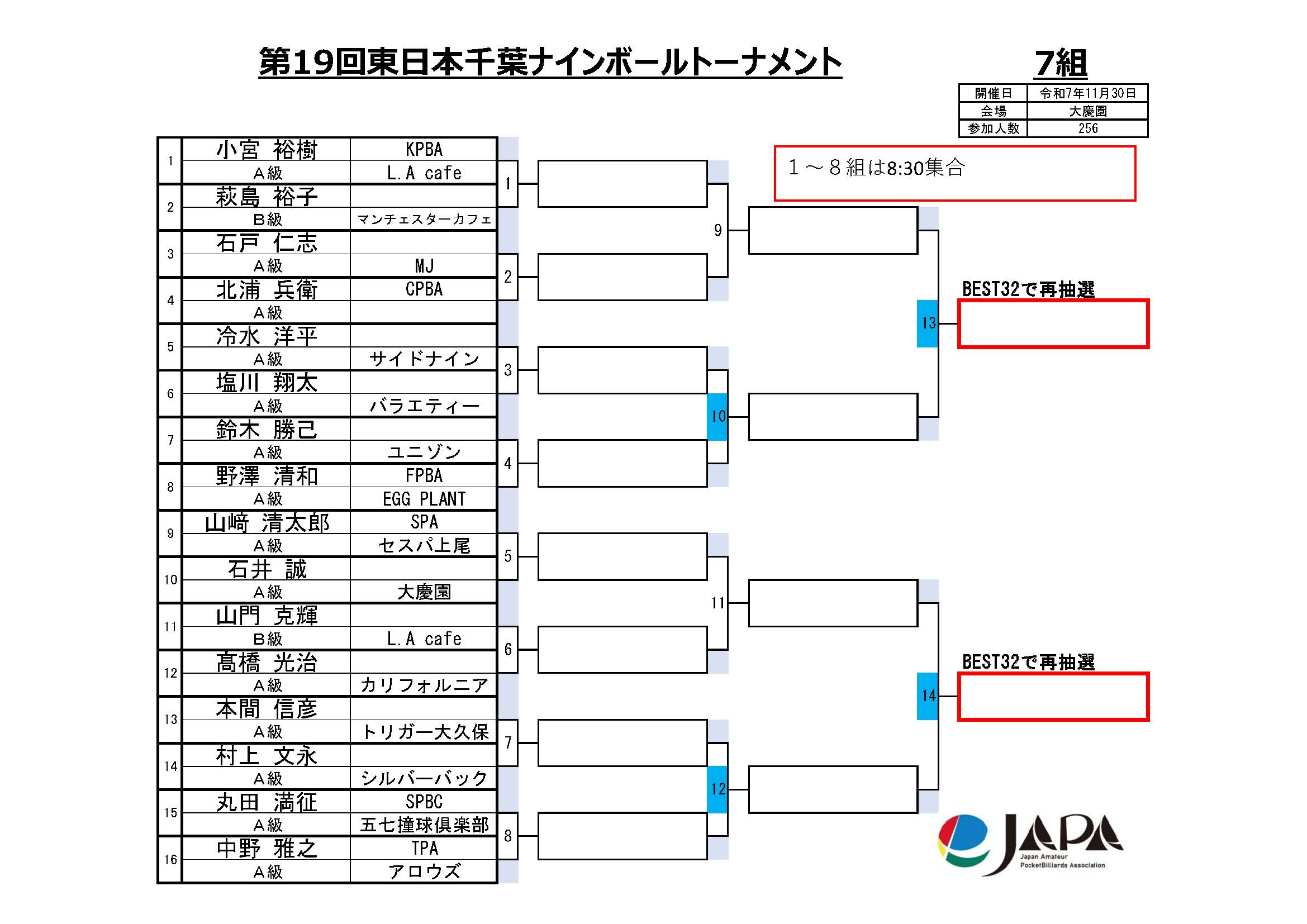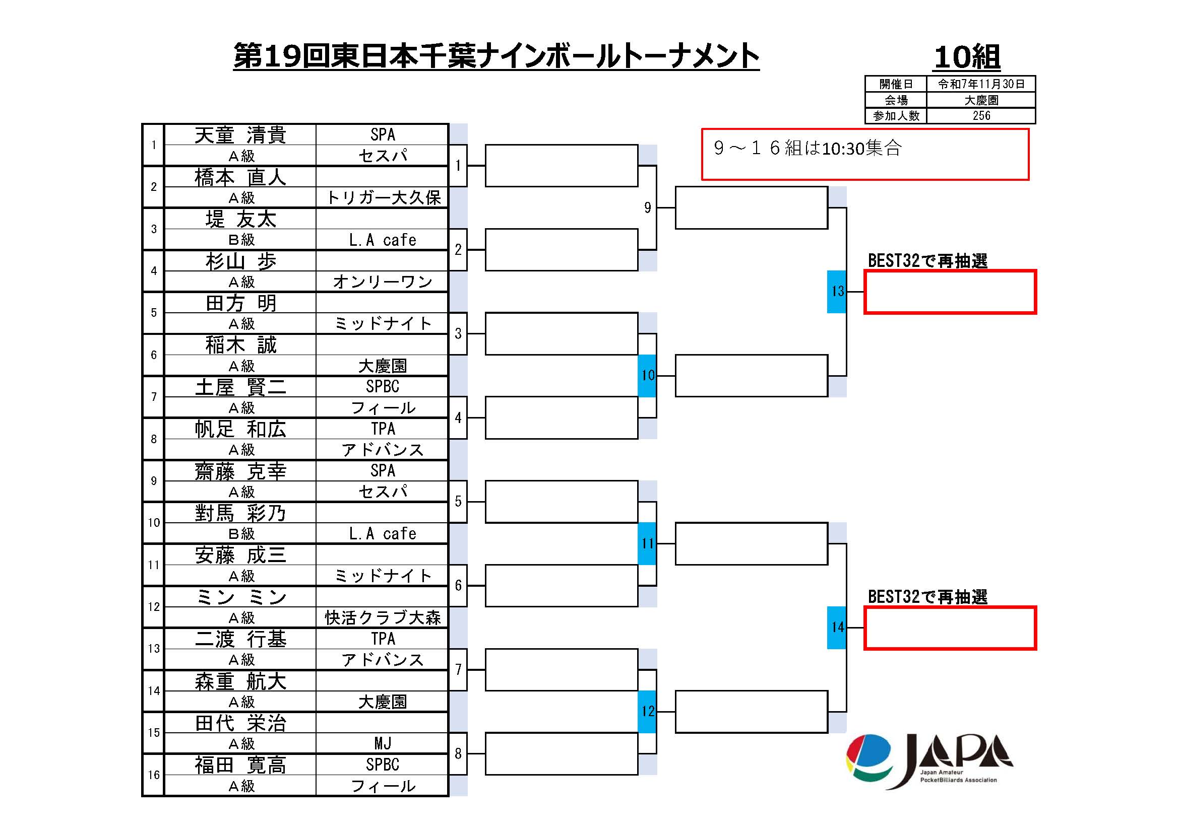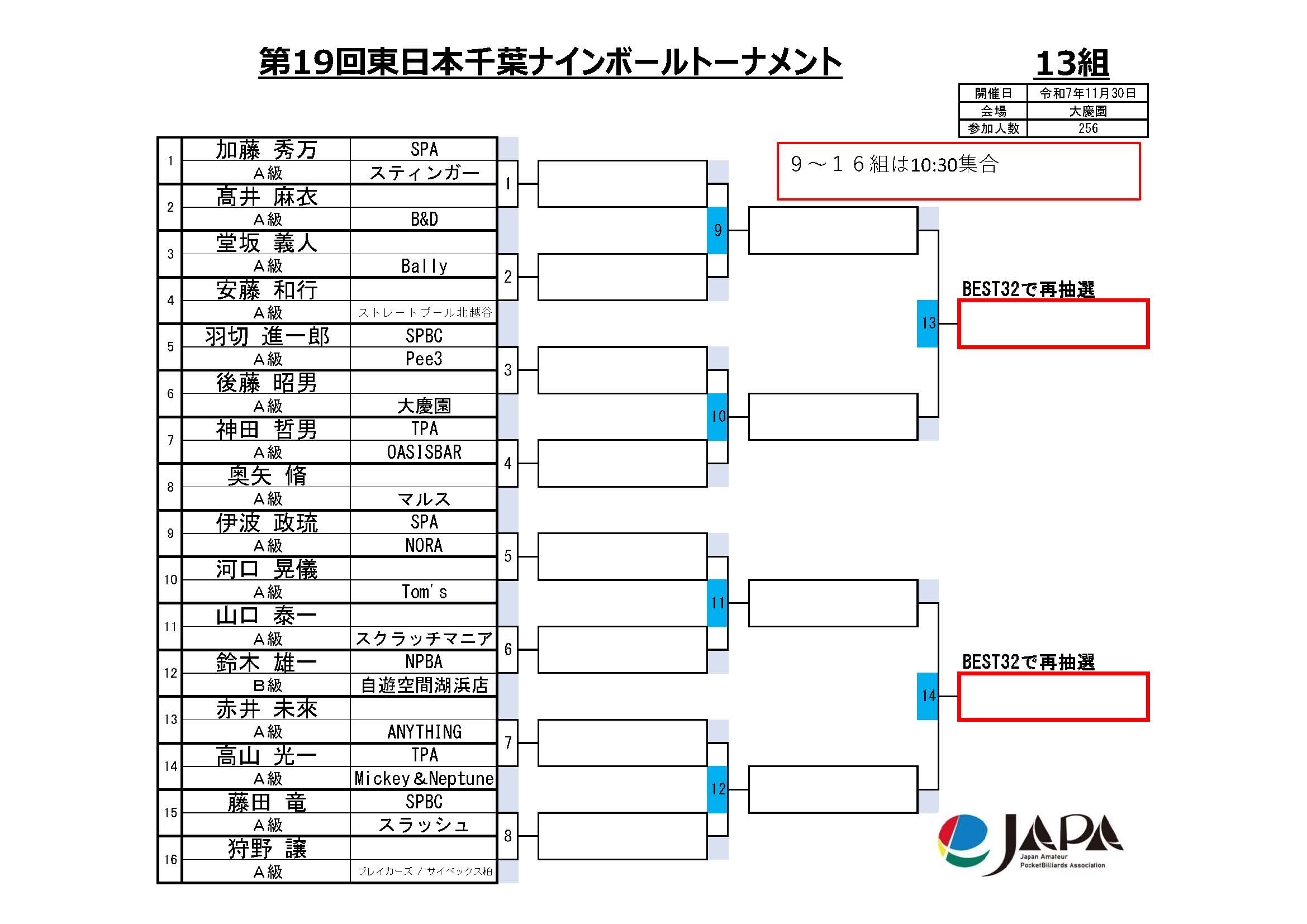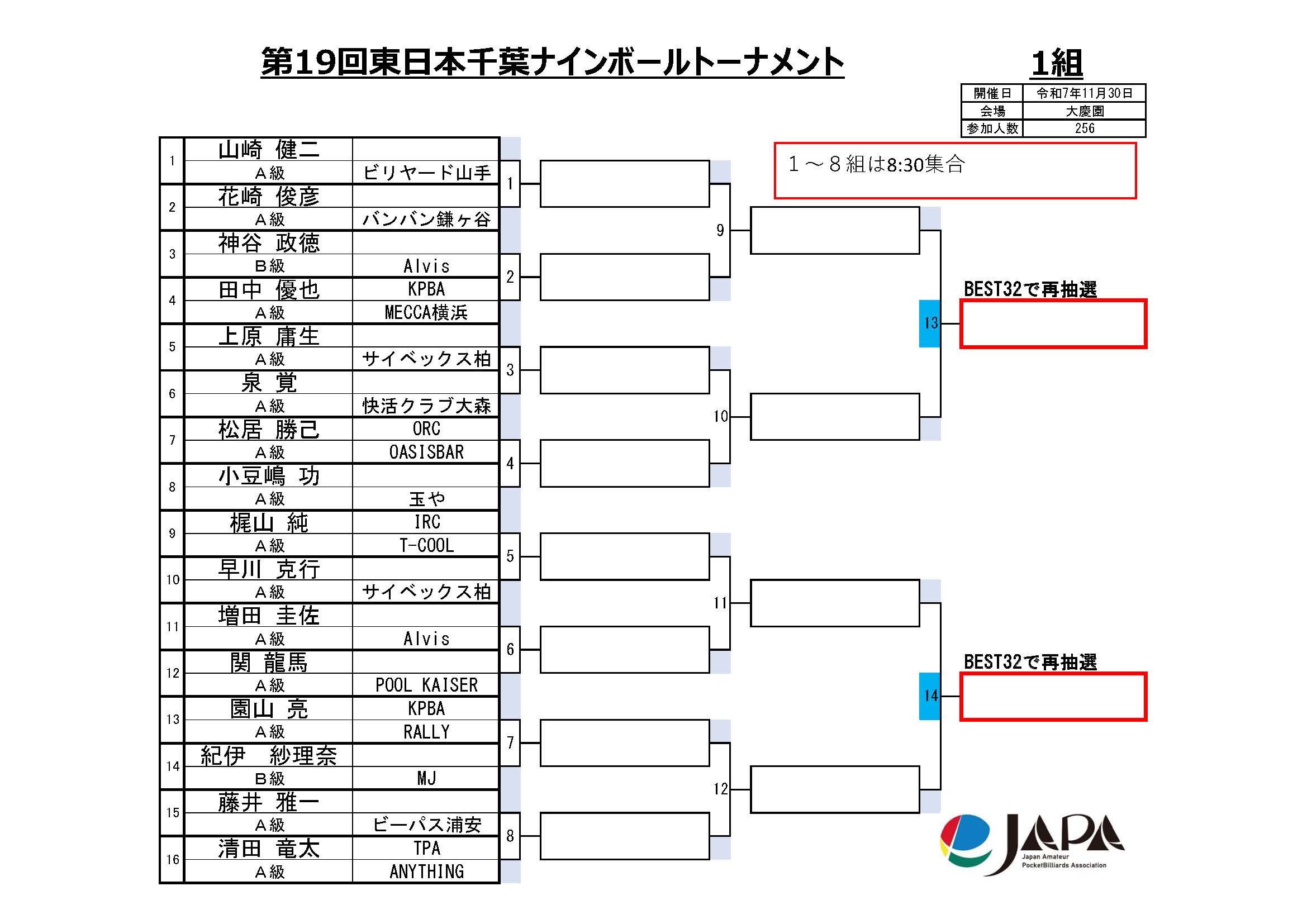 第19回 東日本千葉ナインボールトーナメント、組合せと集合時間