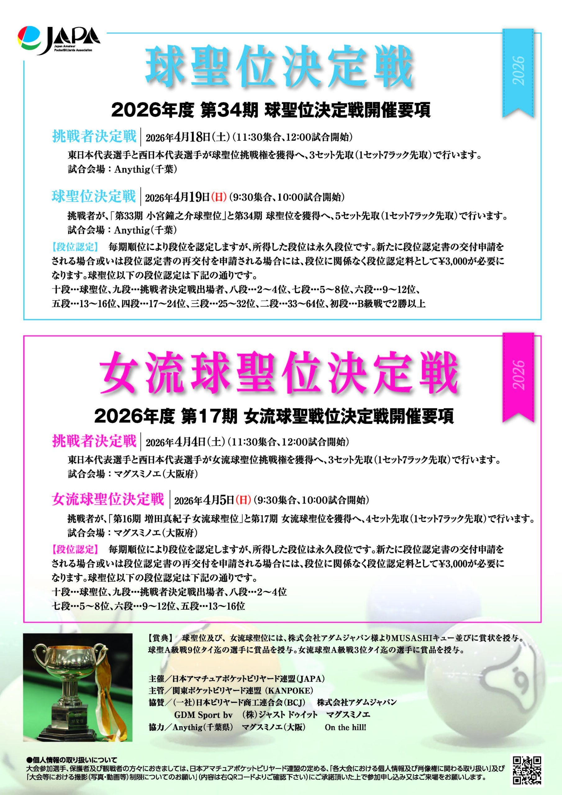 第34期球聖位決定戦、第17期女流球聖位決定戦、開催要項