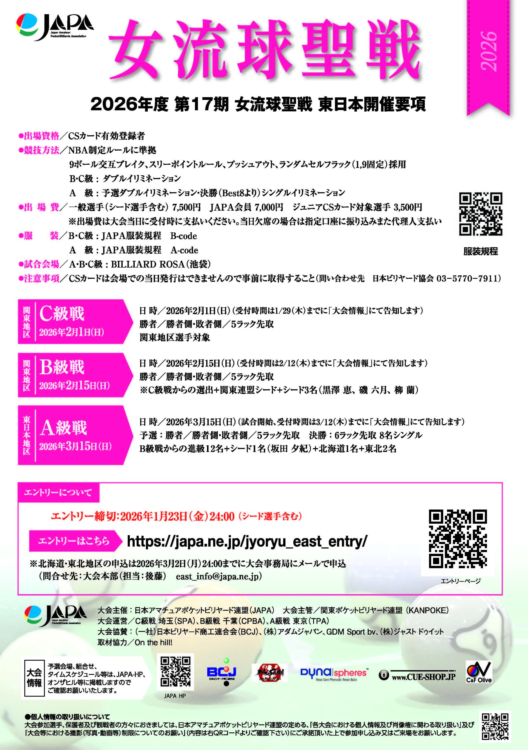 第17期 女流球聖戦、東日本(関東地区)大会、開催要項