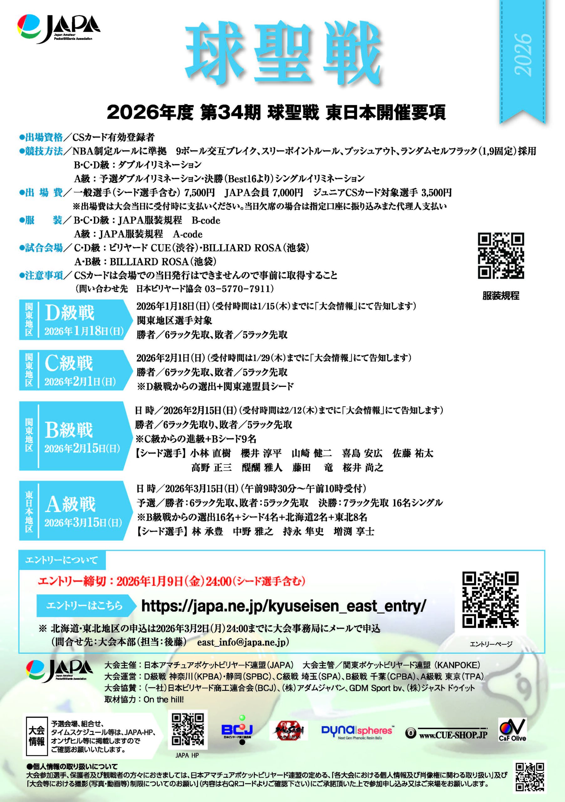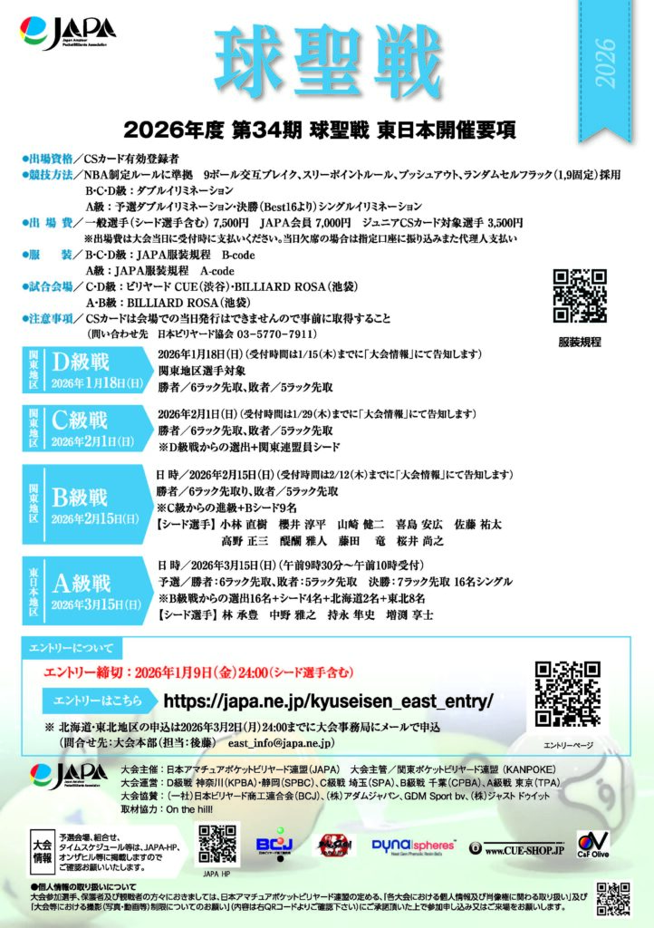第34期 球聖戦、第17期女流球聖戦 東日本開催要項