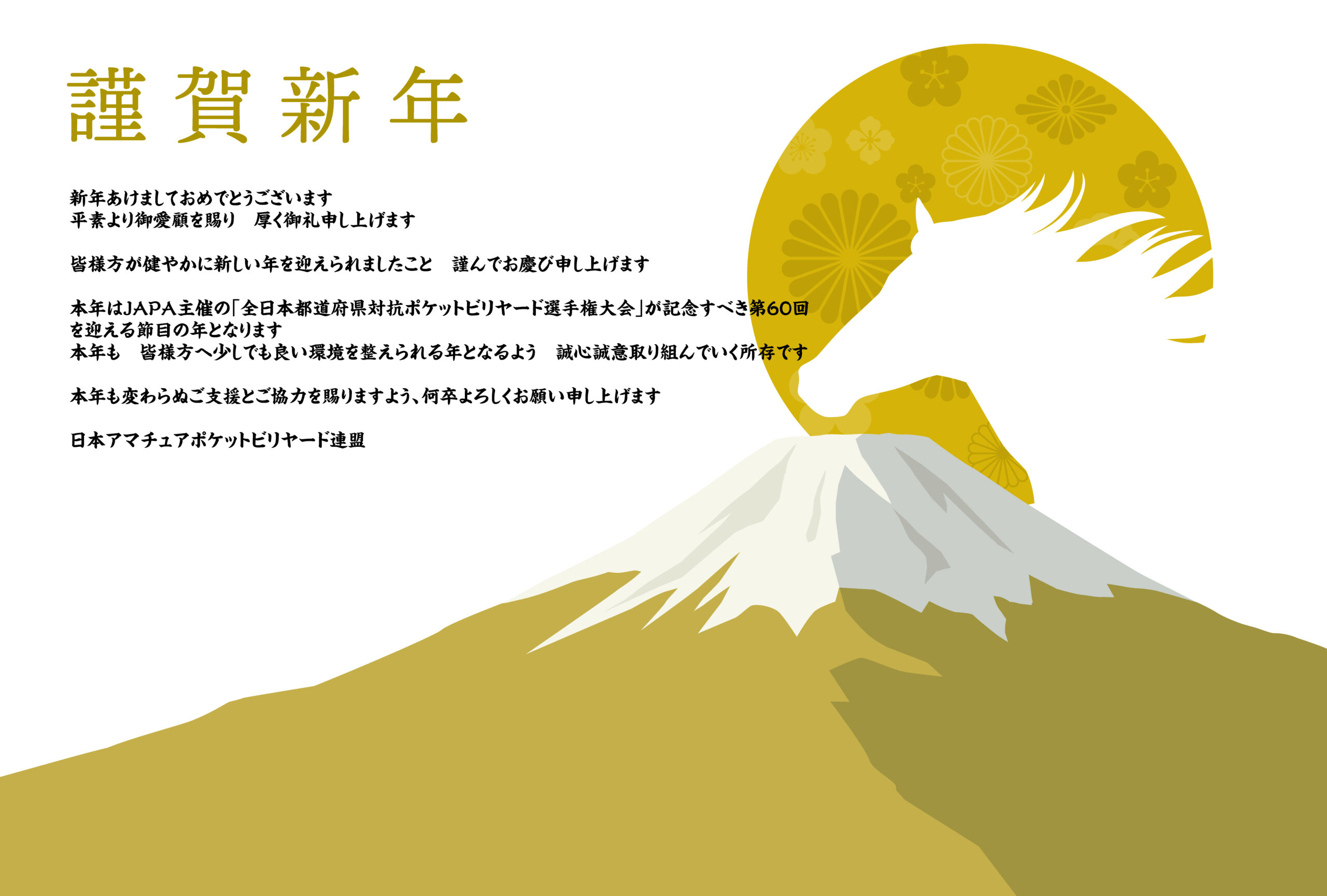 2026年1月1日 / 最終更新日時 : 2025年12月27日 JAPA本部 事務局 お知らせ 謹賀新年 新年あけましておめでとうございます 平素より御愛顧を賜り 厚く御礼申し上げます 皆様方が健やかに新しい年を迎えられましたこと 謹んでお慶び申し上げます 本年はJAPA主催の「全日本都道府県対抗ポケットビリヤード選手権大会」が記念すべき第60回を迎える節目の年となります 本年も 皆様方へ少しでも良い環境を整えられる年となるよう 誠心誠意取り組んでいく所存です 本年も変わらぬご支援とご協力を賜りますよう、何卒よろしくお願い申し上げます 日本アマチュアポケットビリヤード連盟 FacebookXCopy