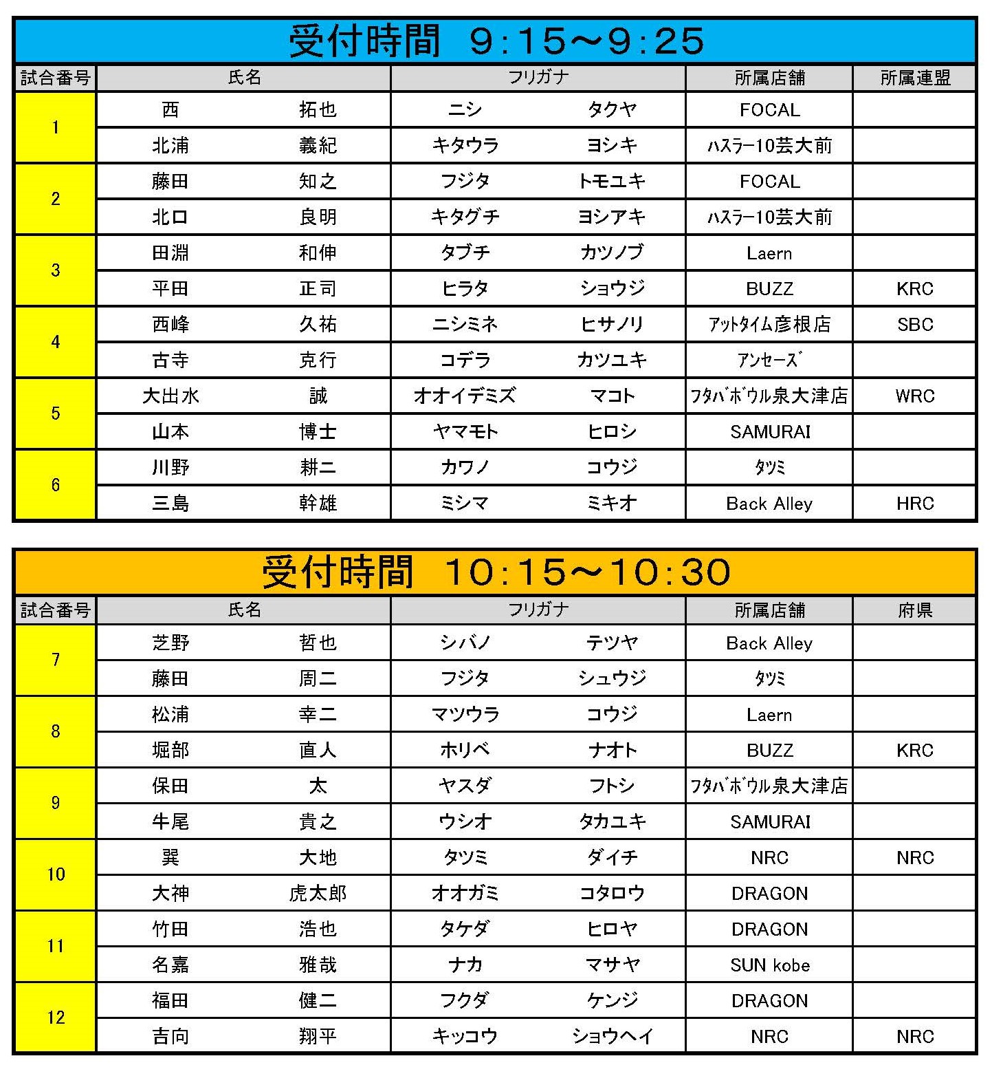 試合番号 7~12番 受付時間 午前10:15~午前10:30