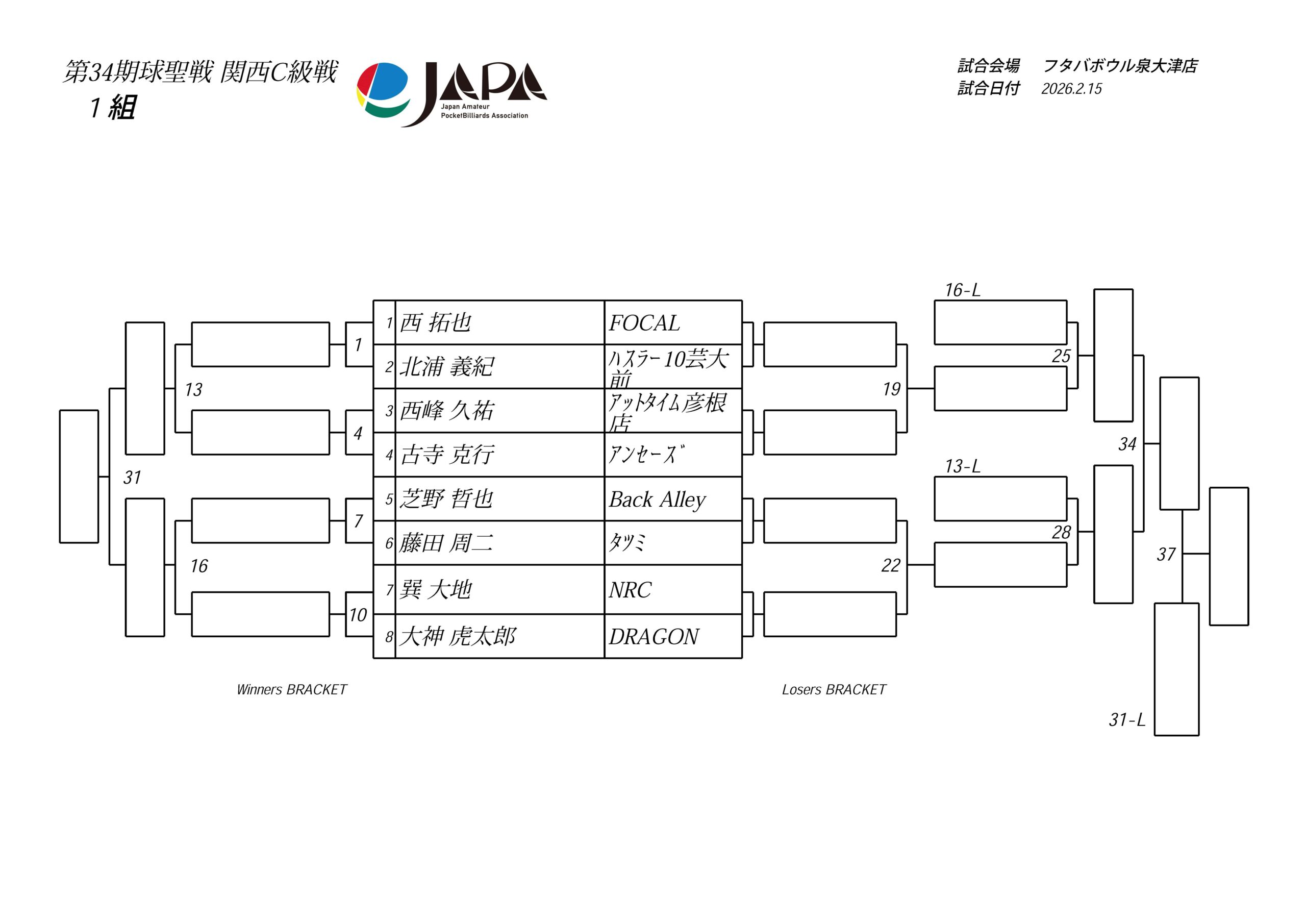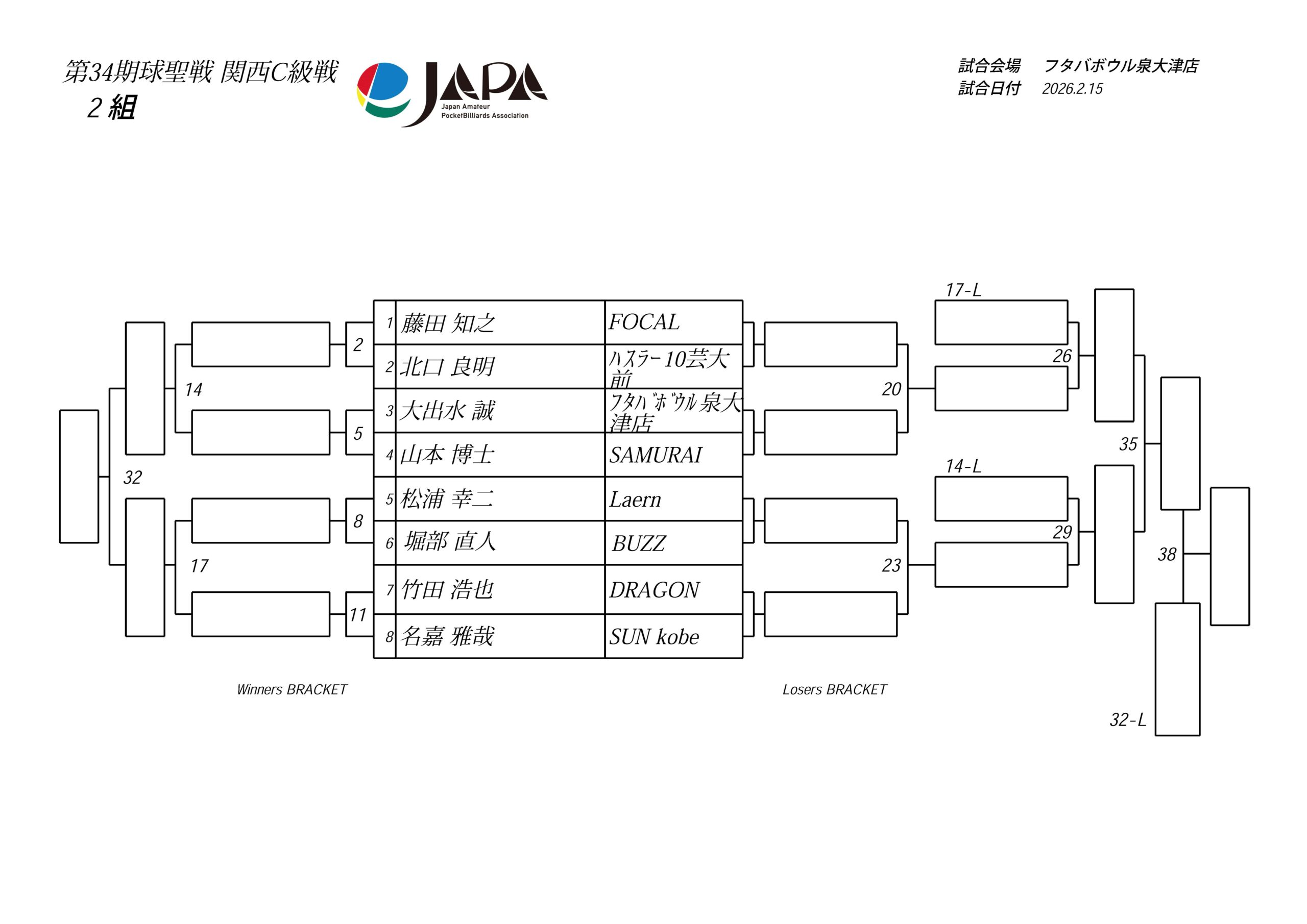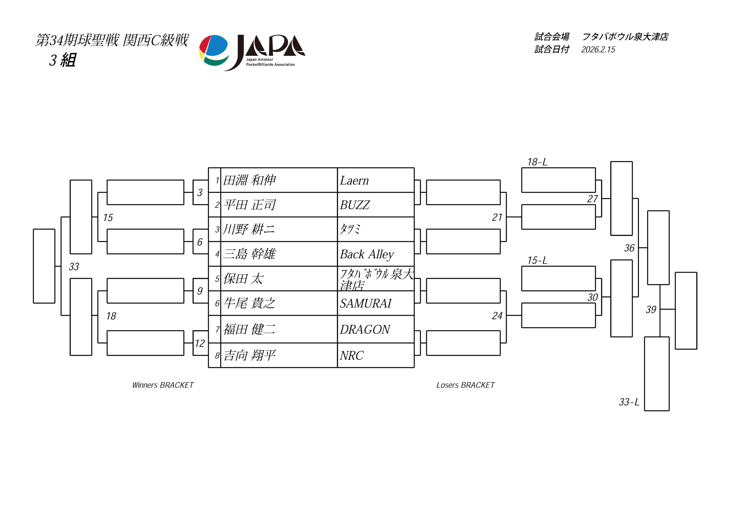 第34期 球聖戦 関西B級戦、組合せと受付時間のお知らせ