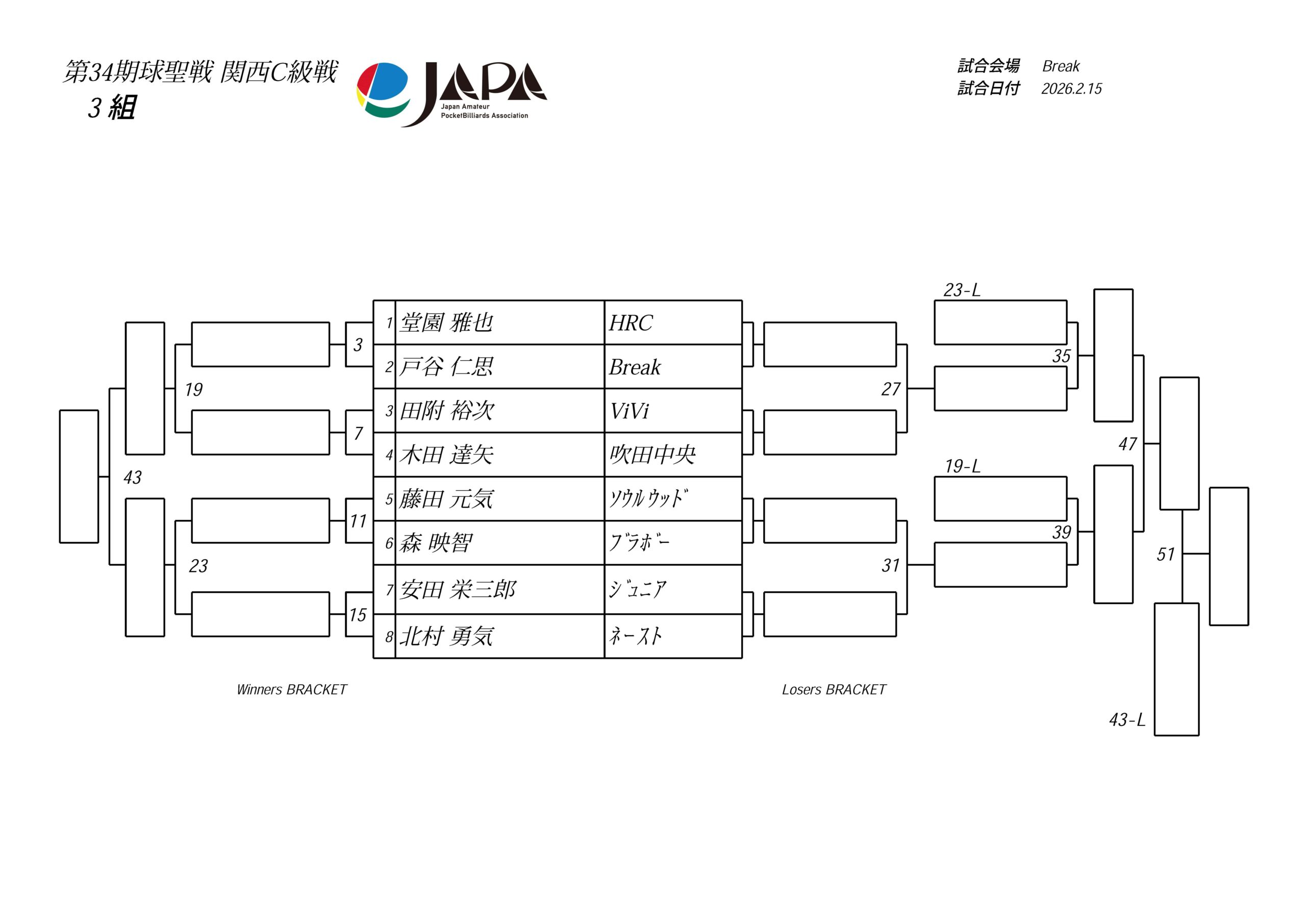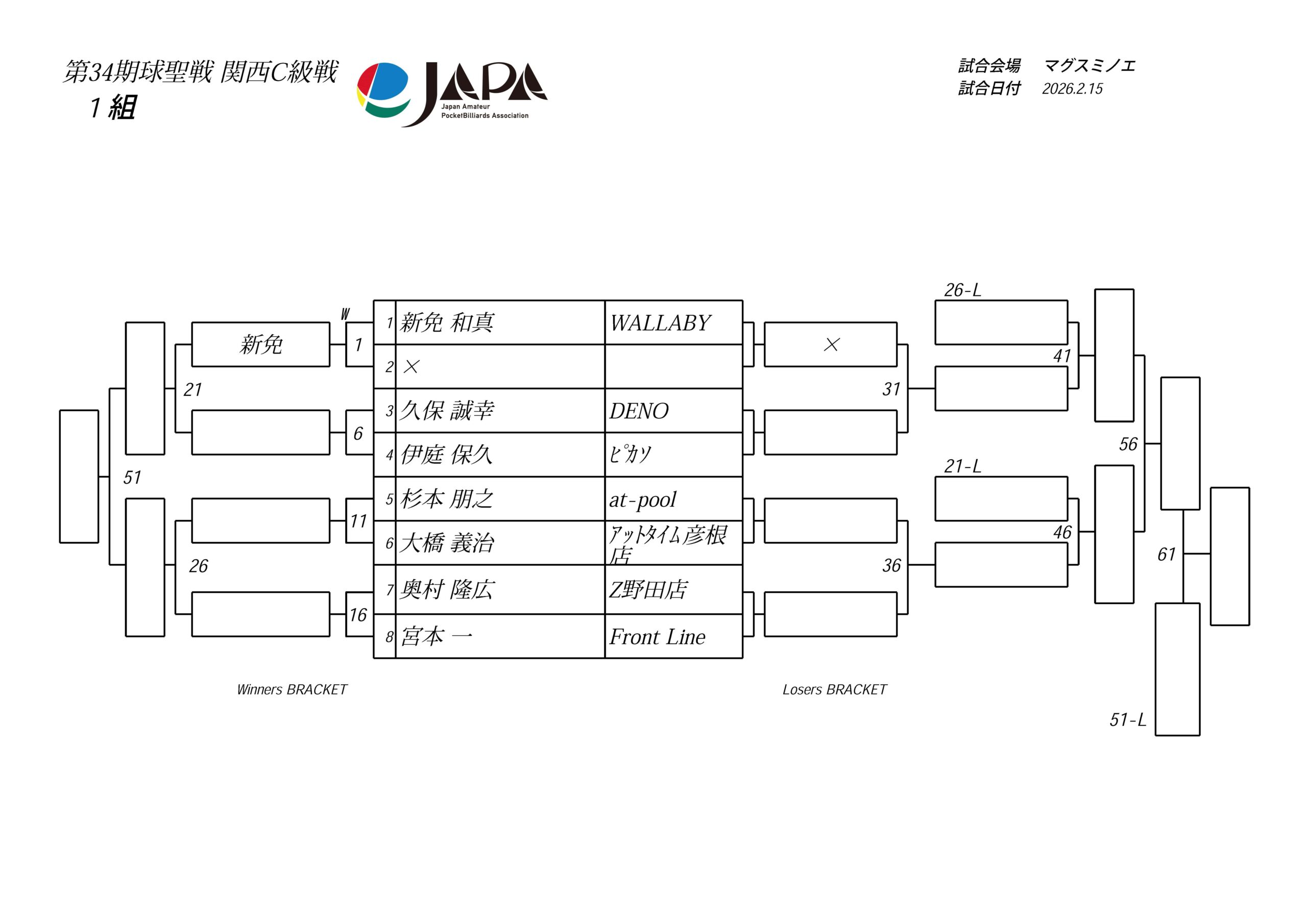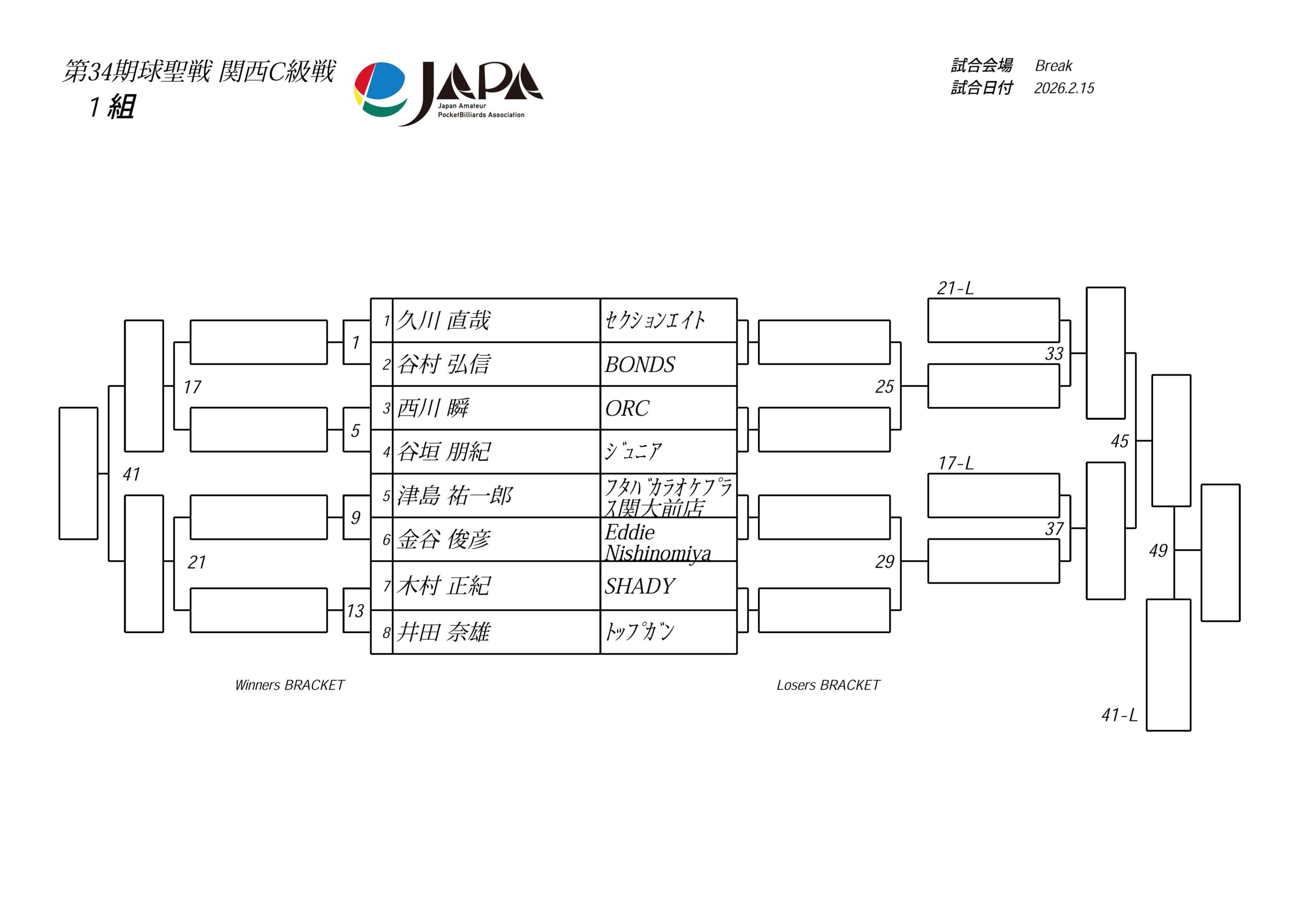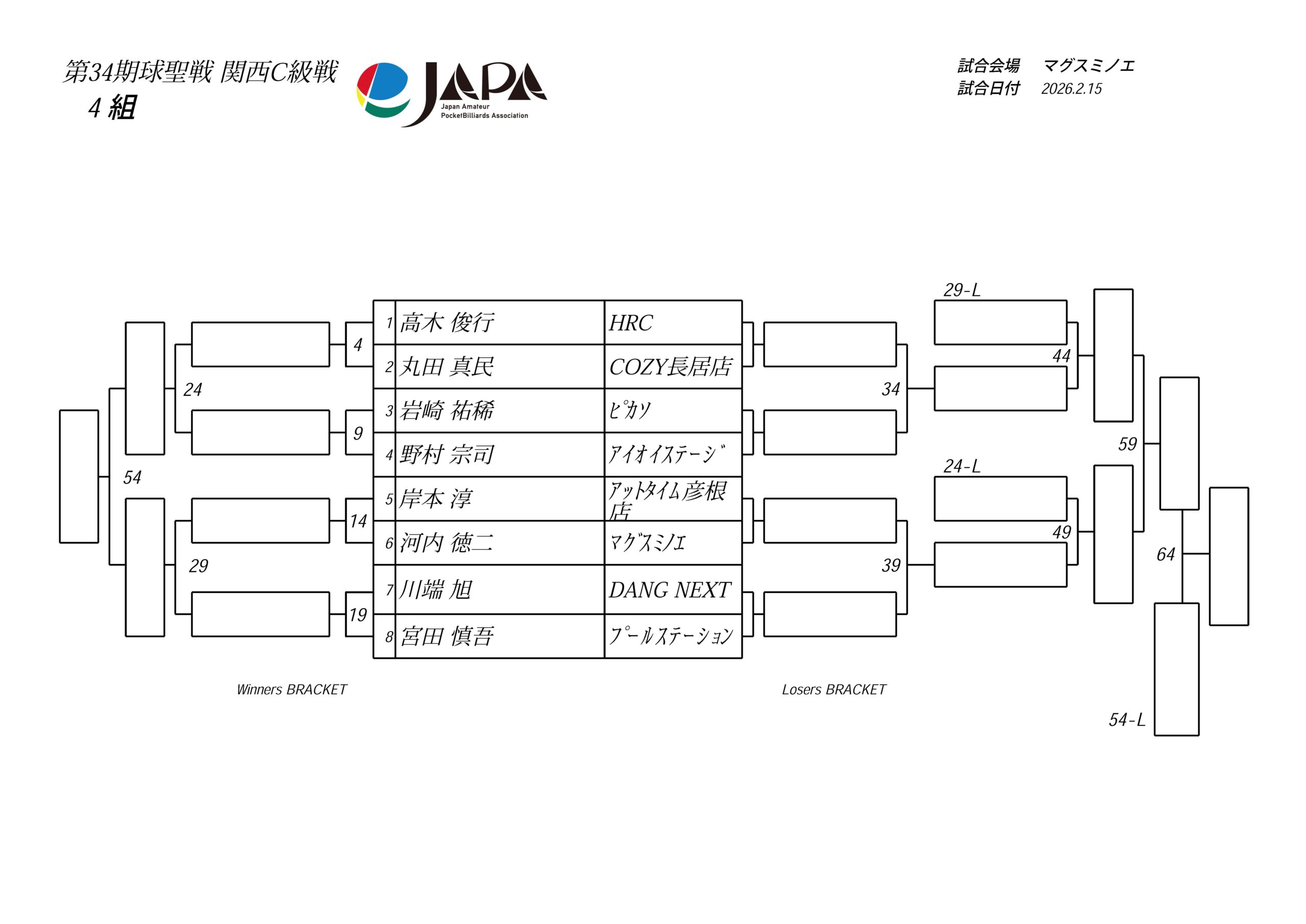 第34期 球聖戦 関西B級戦、組合せと受付時間のお知らせ