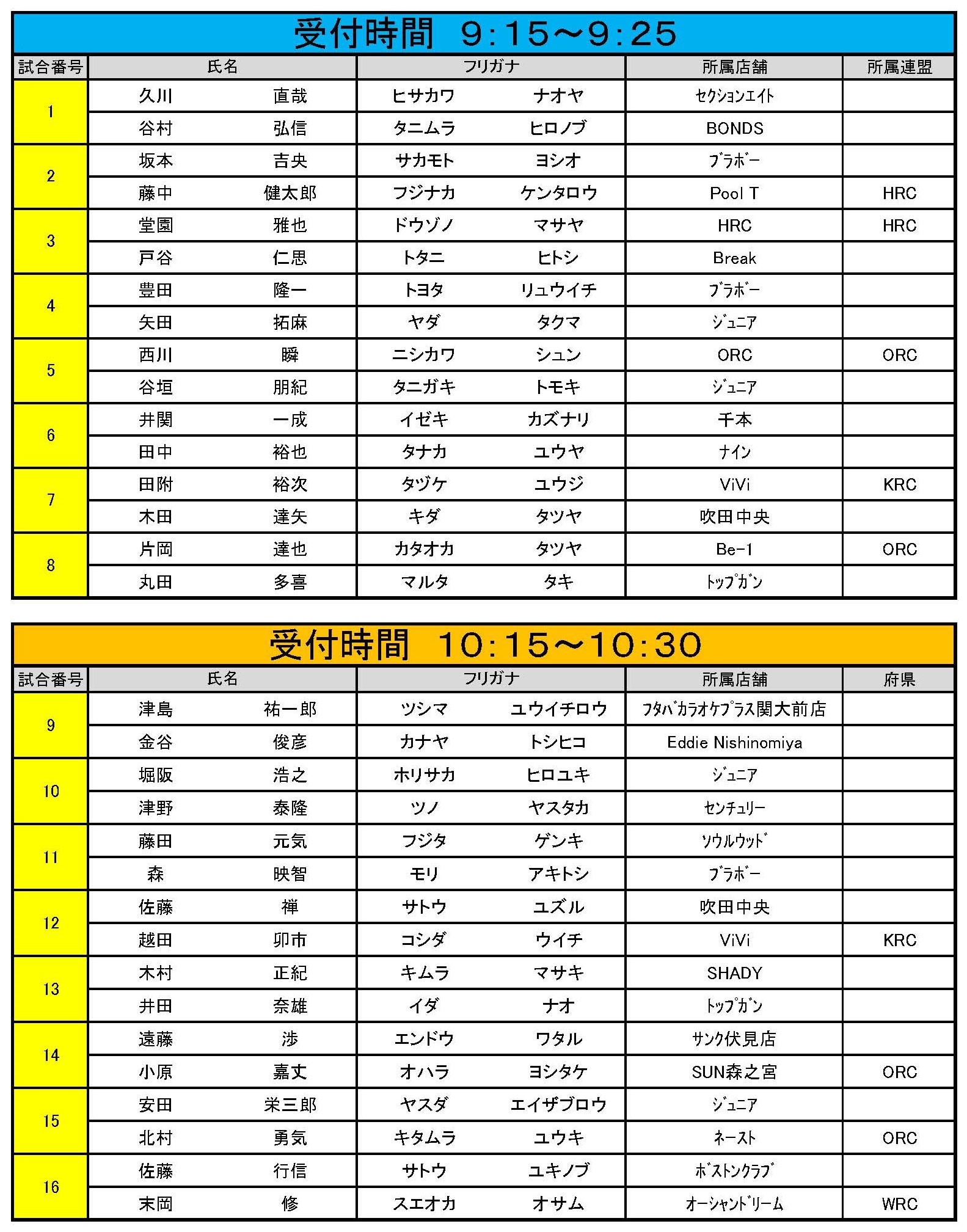 試合番号 9~16番 受付時間 午前10:15~午前10:30