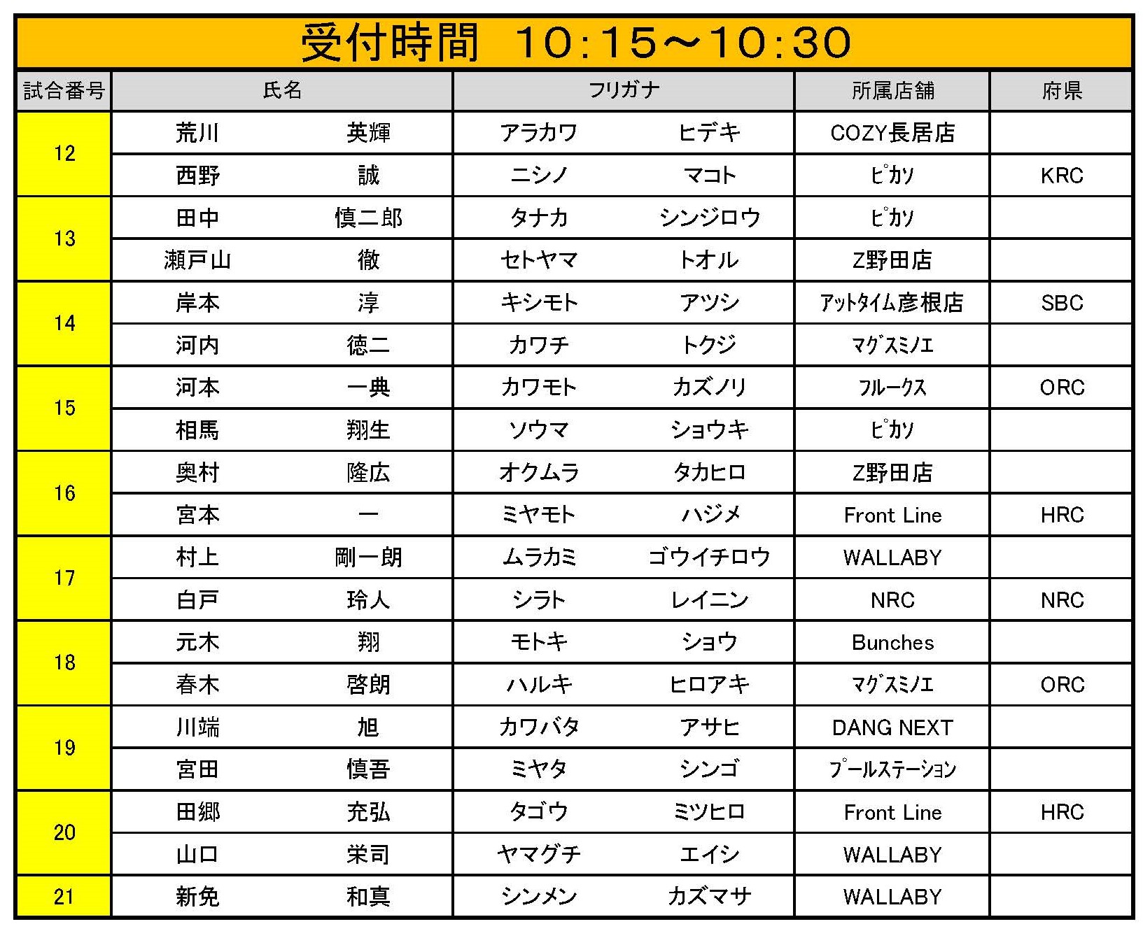試合番号 12~21番 受付時間 午前10:15~午前10:30