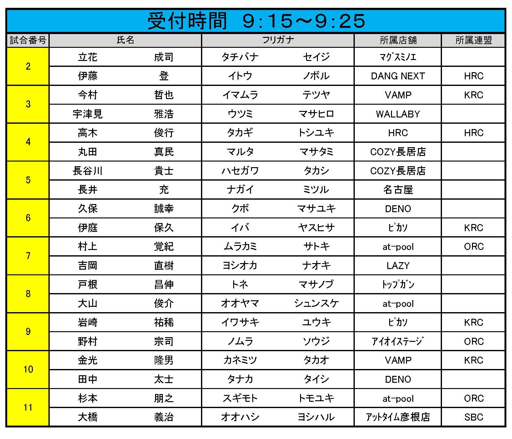 試合番号 2~11番 受付時間 午前9:15~午前9:25