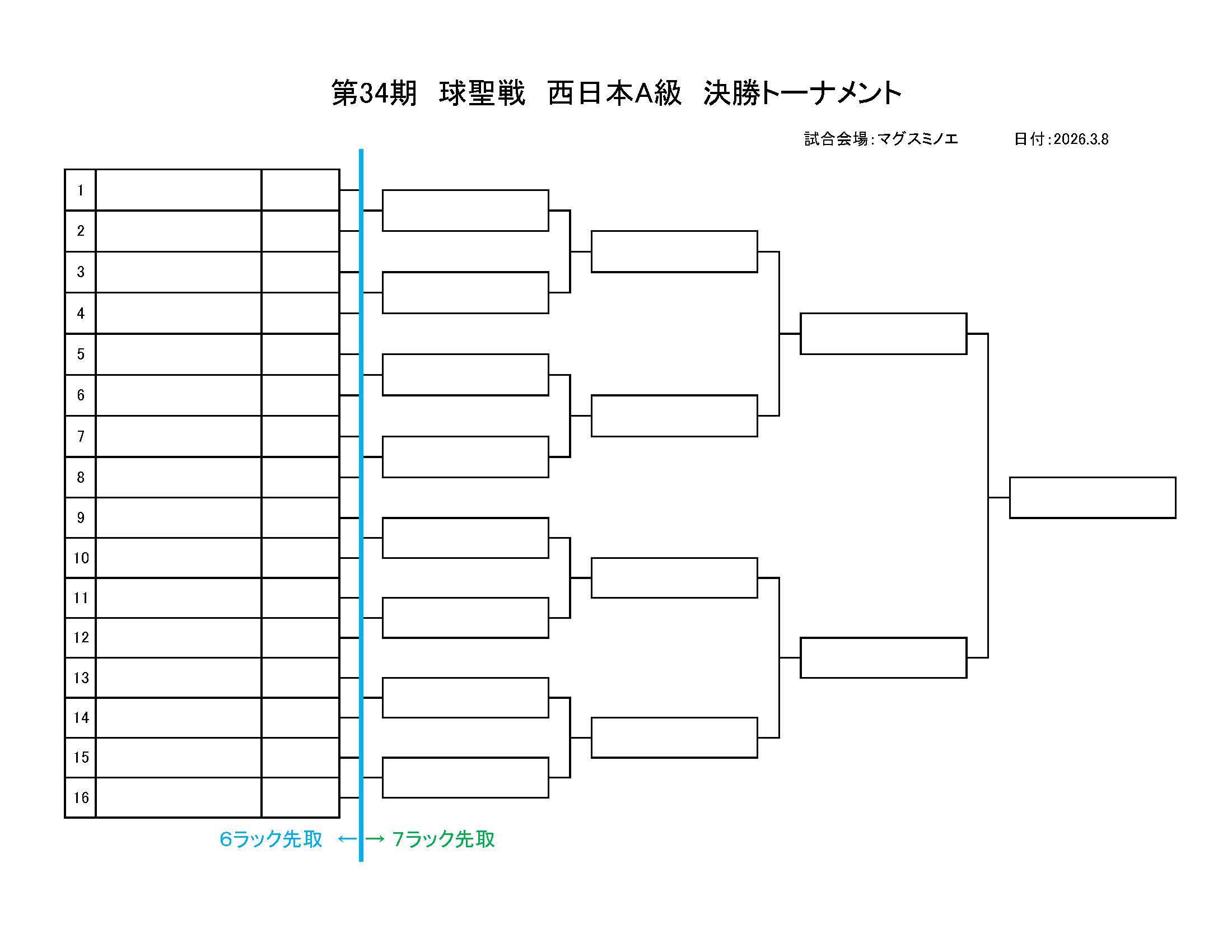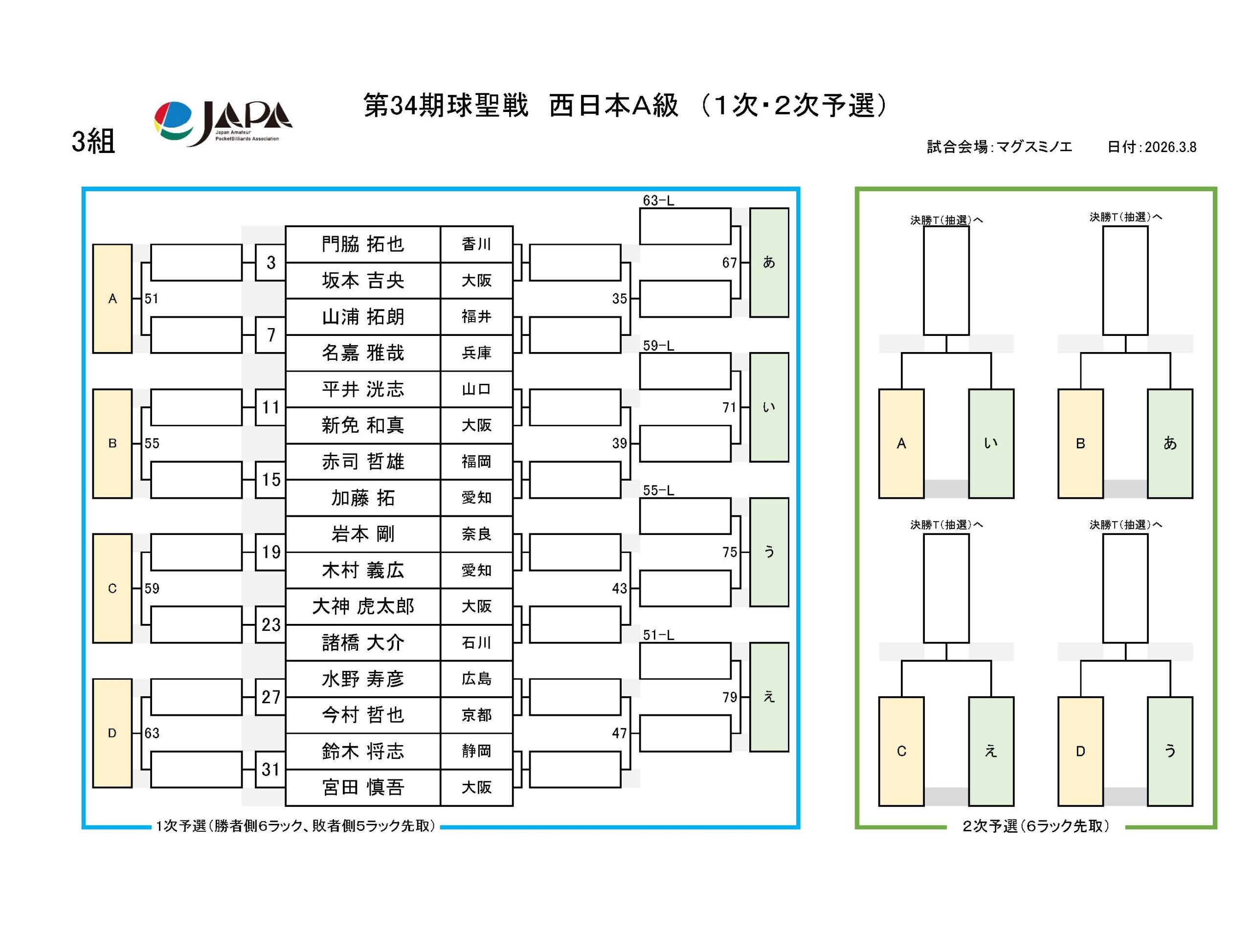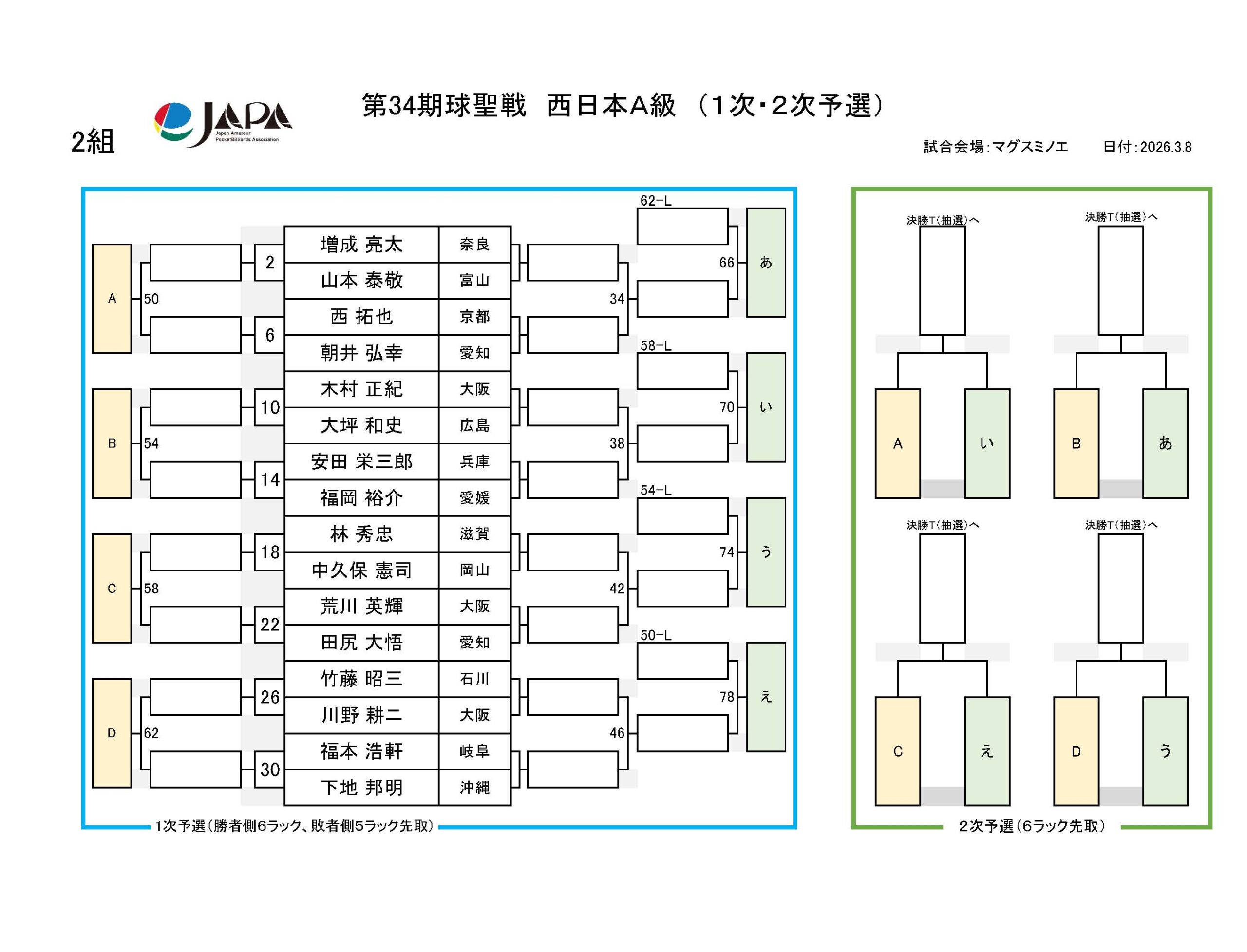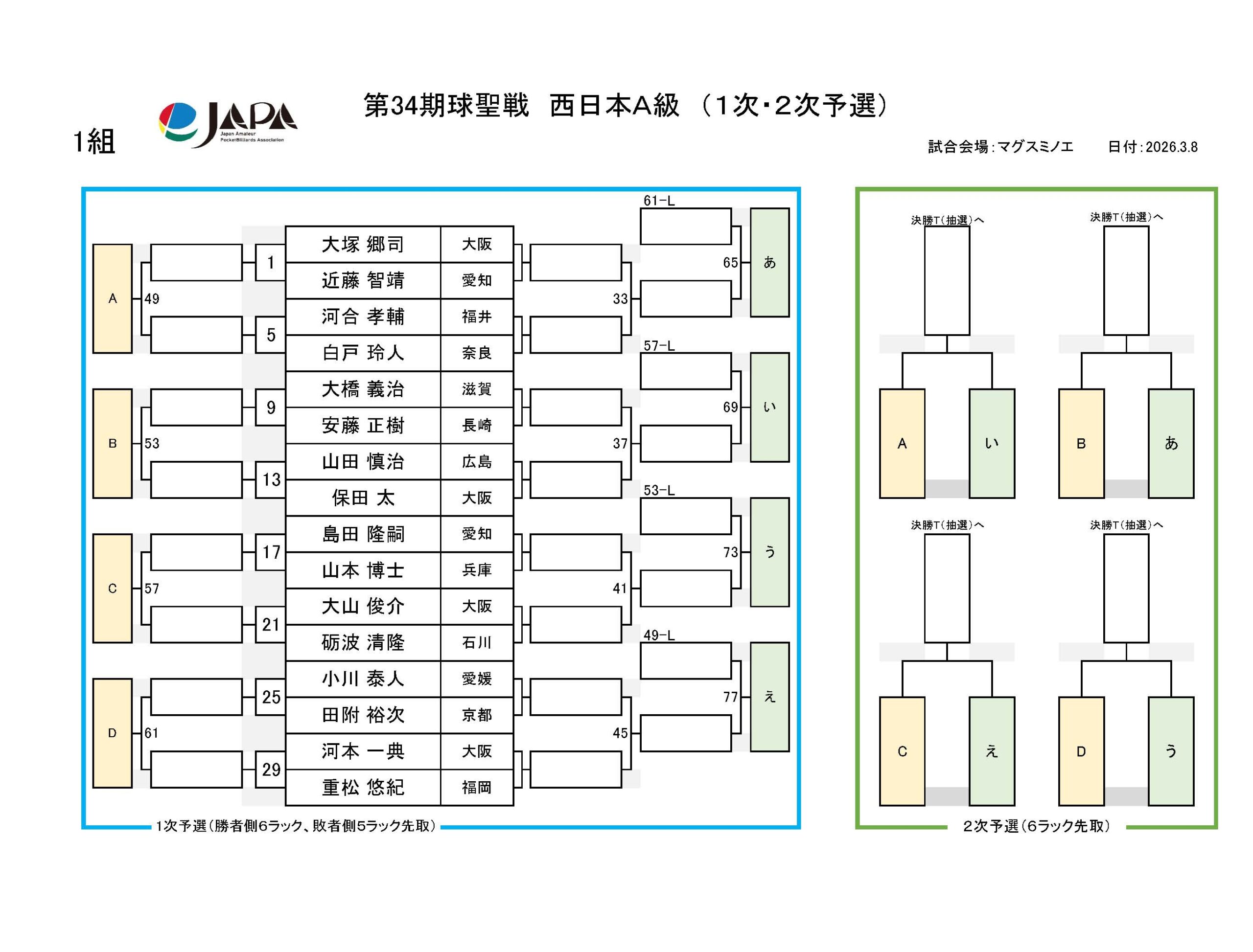第34期 球聖戦 西日本A級戦、組合せと受付時間のおしらせ