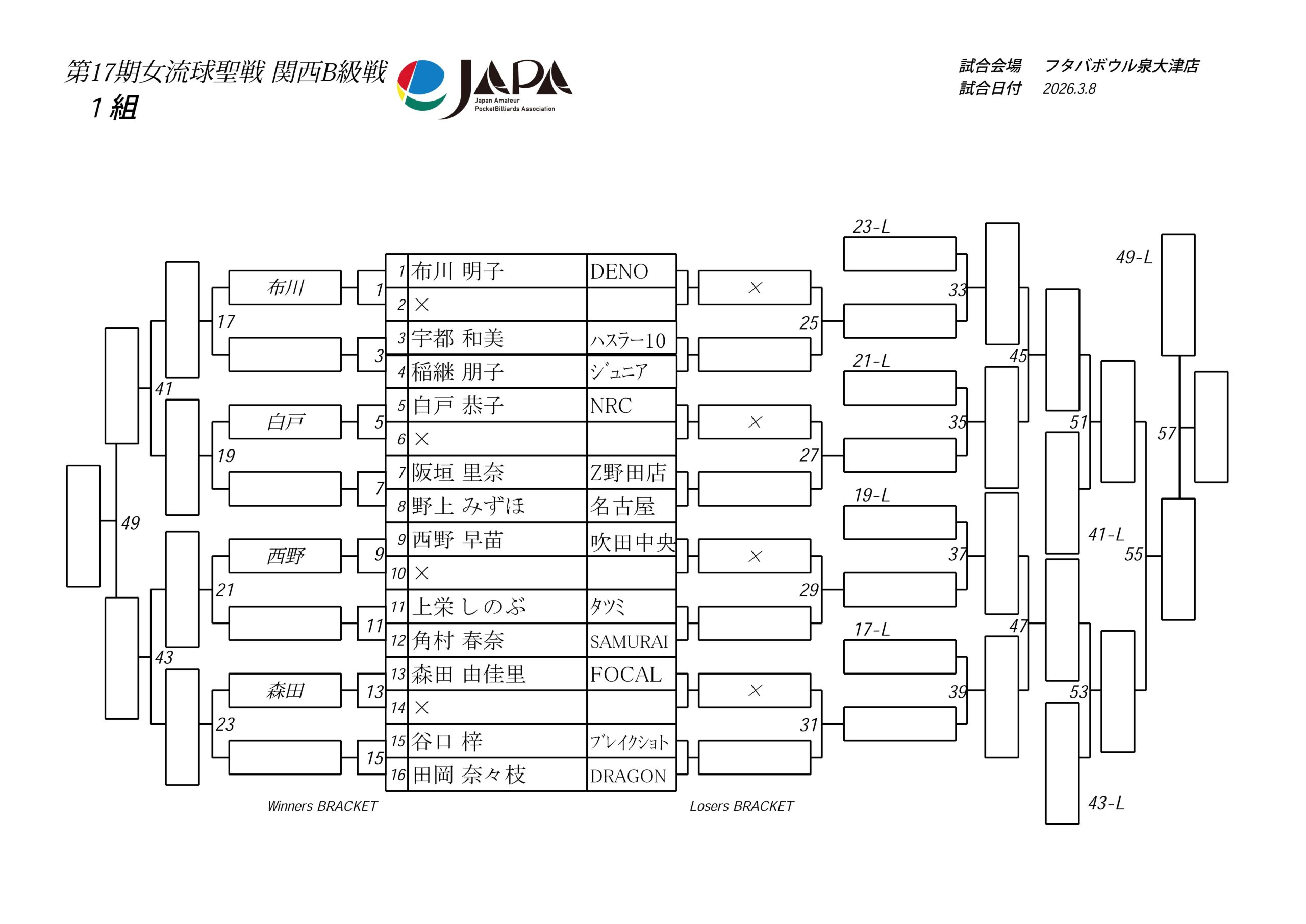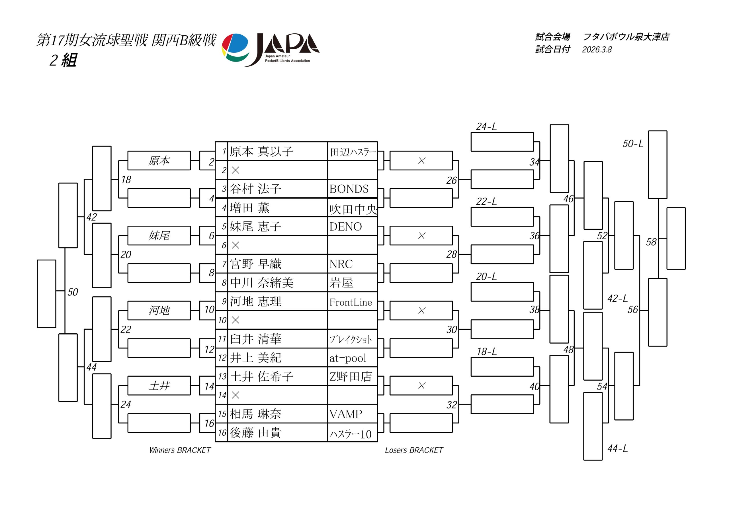 第17期 女流球聖戦 関西B級戦、組合せと受付時間のおしらせ