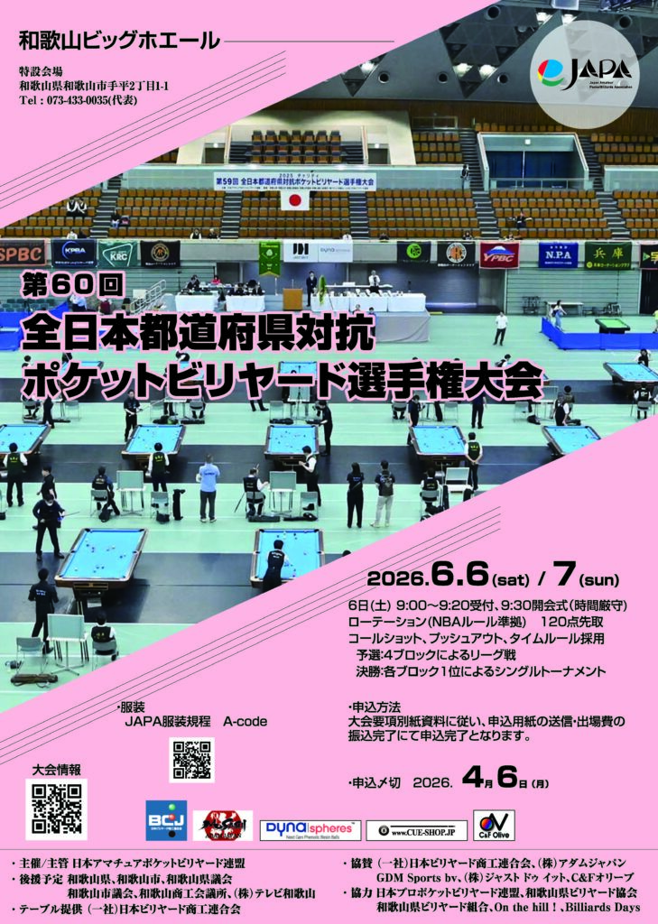 このたび、第60回全日本都道府県対抗ポケットビリヤード選手権大会におきまして、全国すべての都道府県より出場が確定いたしました。