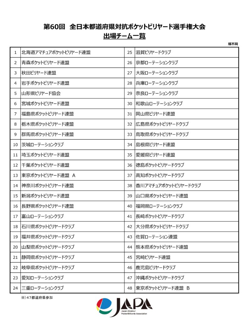 第60回全日本都道府県対抗ポケットビリヤード選手権大会、出場チーム一覧PDFはこちら